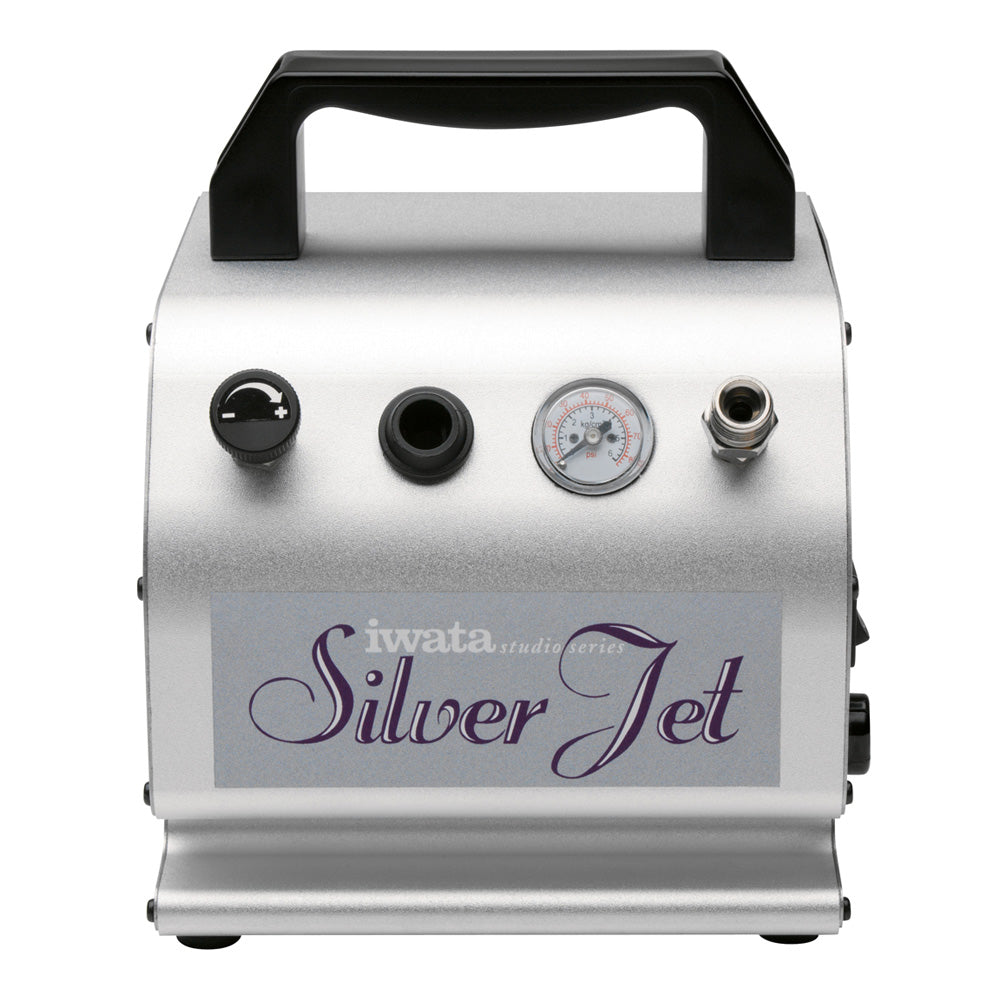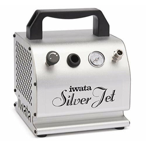 The Iwata Silver Jet compressor proves ideal for the hobbyist or professional user who wants a small, reliable source of air in an attractive and feature-rich design. The Silver Jet's quiet and compact size makes it ideal for use in small work spaces and quick set ups. It will power most gravity feed airbrushes for low pressure applications of around 1 to 18 PSI.