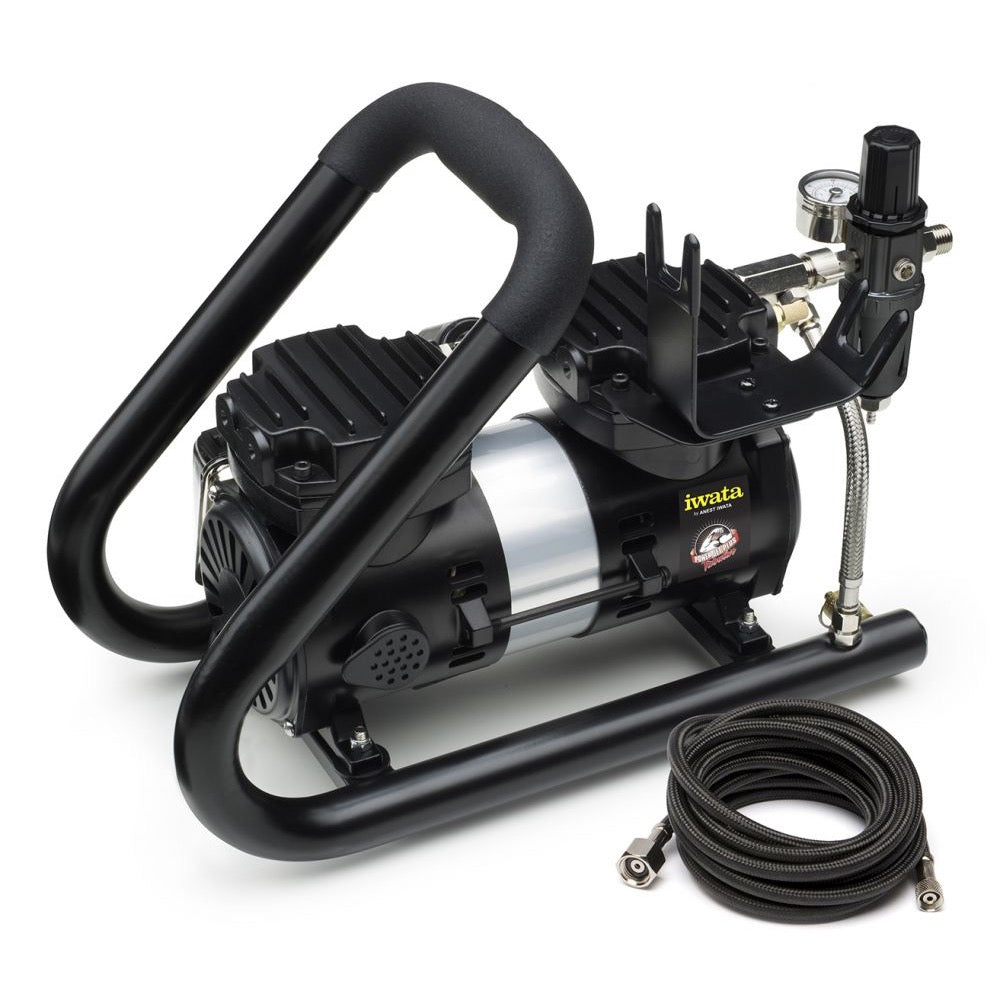 Iwata Power Jet Plus Tubular airbrush compressor has a built-in airbrush holder and comes with a high-strength braided nylon covered airbrush hose that fits Iwata airbrushes. Also included is a extra air intake filter, adapter fittings for Badger, Aztek and Paasche brand airbrushes and a detailed operation manual.