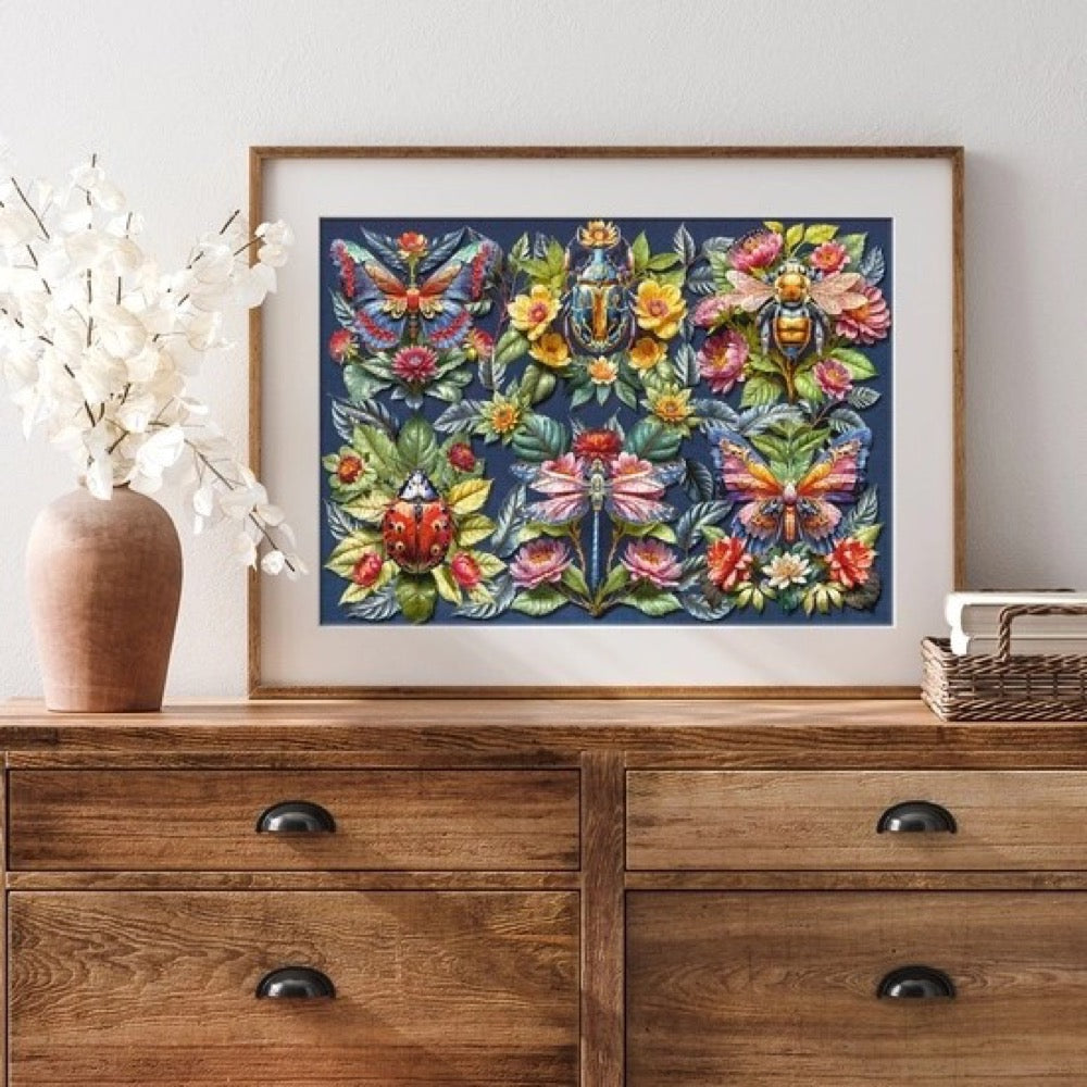 This unique and vibrant image showcases a tapestry of nature’s small wonders, including detailed butterflies, a dragonfly, ladybugs and beetles. The backdrops of flowers and leaves enhance the beauty of these creatures, creating a sense of harmony and elegance in nature. You can solve this puzzle and be a witness a small miracles.