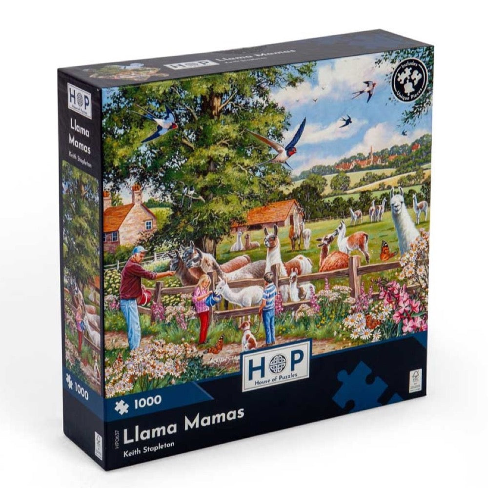 Get ready to start your next House of Puzzles project! Illustrated by extraordinary artist Keith Stapleton, the Llama Mamas 1000 piece jigsaw features a beautifully detailed scene to captivate both beginner and seasoned puzzle fanatics!