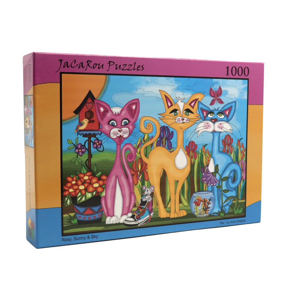 Say hello to Rosy, Sunny & Sky, the adorable trio of cats in this fun-filled 1000 Piece Jigsaw Puzzle by JaCaRou! This vibrant and playful puzzle brings a pop of color and whimsy to your puzzling adventure. With bold shades of pink, yellow, and blue, these curious kitties are surrounded by a lively garden, charming flowers, and a mischievous little mouse. Whether you're an animal lover or simply enjoy colorful, creative art, this puzzle is guaranteed to captivate your attention and provide hours of entertainment.