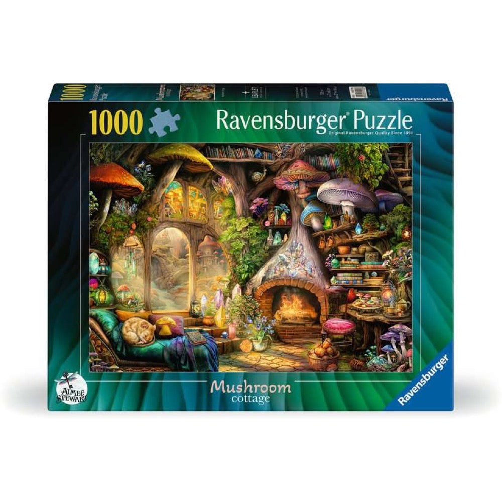 Step into a world of cozy woodland magic with this delightful 1000-piece jigsaw puzzle featuring the charming "Mushroom Cottage" nestled deep in the heart of an enchanted forest, this whimsical scene captures the warmth and comfort of a hidden haven where nature and fantasy meet. A bookcase carved into a nearby tree is filled with well-worn volumes, suggesting a love for stories and adventures. Outside the window, a serene waterfall cascades into a sparkling brook, adding a soothing soundtrack to this tranquil retreat. A basket of acorns sits near the fire, hinting at the simple pleasures of woodland life. On a small wooden desk, a delightful spread of cakes and a steaming pot of tea await, offering a perfect invitation to relax and enjoy the quiet beauty of this magical world.