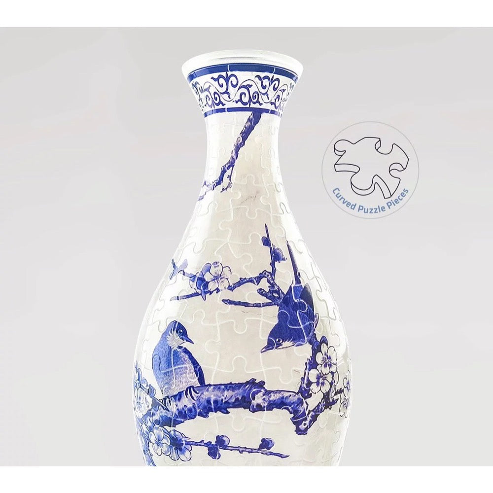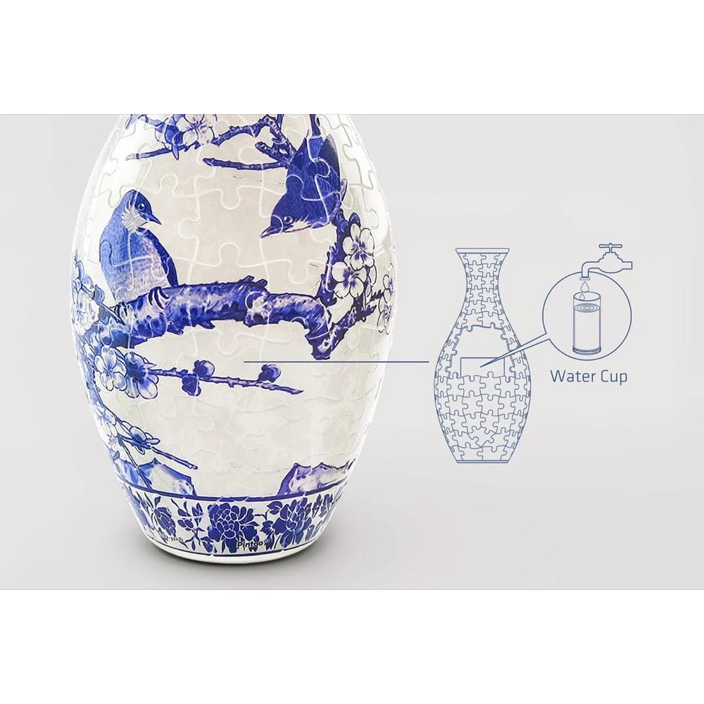 3D Puzzles Vase - Contains 160 translucent curved puzzle pieces with a detachable water cup and stand. The finished size is 4.4 inches in diameter and 9.5 inches in height without a stand. *The translucent puzzle pieces make the pattern looks more soft and lively in different lighting.