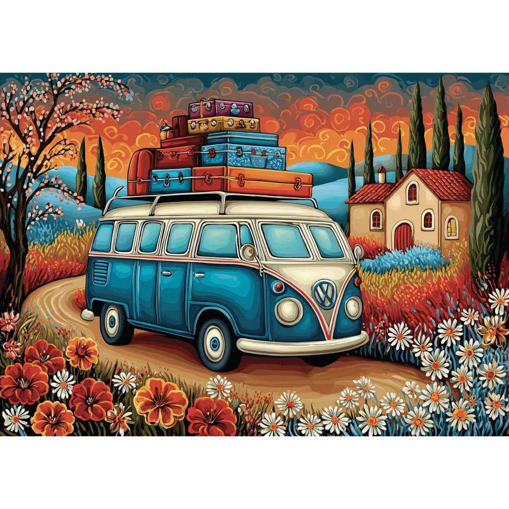 Van Life Escape captures the spirit of freedom and travel, featuring a classic van packed for the journey, winding through a colorful countryside filled with blooming flowers, rolling hills, and warm sunset skies. Every detail radiates wanderlust and relaxation, turning this picture puzzle into a mini getaway you can enjoy piece by piece. It’s a perfect choice for fans of beautiful puzzles who dream of slow travel, cozy escapes, and carefree exploration.
