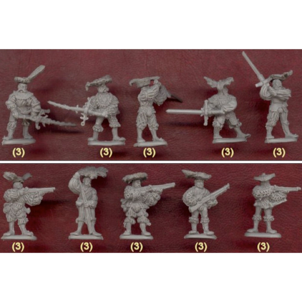 As regards costume, there can be few soldiers to match the Landsknecht. Their flamboyant clothing was considered outrageous even at the time, and though there was no uniform as such, these figures display all the characteristics of their incredible appearance. The clothing with all its slashes, the hose and in particular the enormous hats are all present, as are more subtle aspects of their clothing like the Kuhmäule or cow's mouth footwear that covered little more than the sole of the foot.