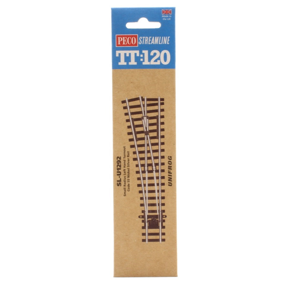 Peco Streamline TT:120 12mm gauge left hand small radius unifrog turnout. The TT:120 range using Pecos' code 55 rail to represent 113lb flatbottom rail. Length 135mm/5.3in, nominal curve radius 466mm/18.3in, diverging angle 11.25 degrees.