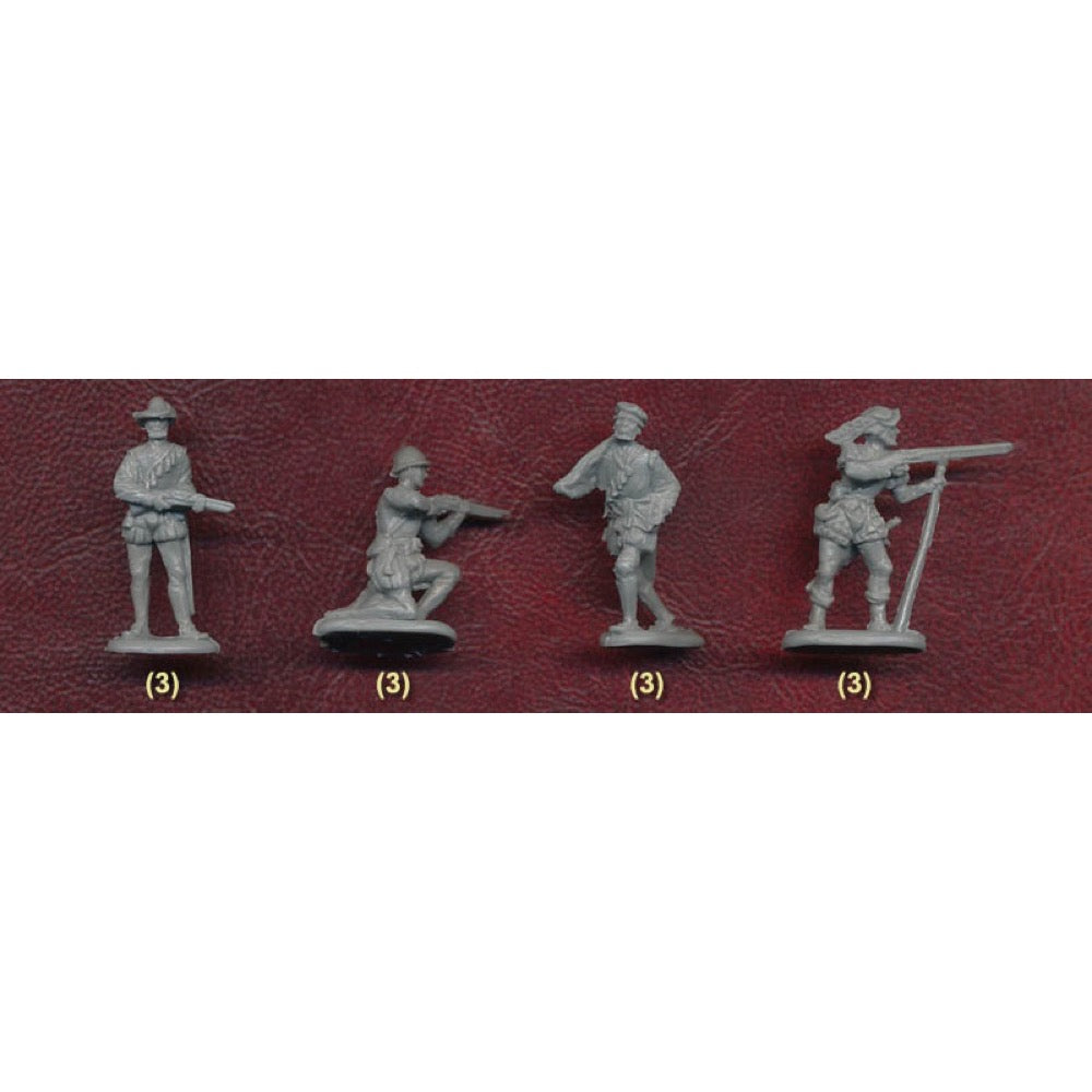 The figures in this set wear a variety of doublets and short trunk-hose (or gregüescos) plus a codpiece. The style of these garments places these men firmly in the second half of the 16th century, especially after 1575 when the particularly short trunk-hose were in fashion. All here look to be pinked or slashed, which was highly fashionable at the time, and soldiers took care to be well dressed where possible. A few here wear helmets of various styles, but the majority wear soft hats, again varied in style, some of which are decorated with a plume or feathers. Knee-breeches were replacing trunk-hose by the last years of the century, but no one here has these, so the actual dates for these figures would be c.1550 to c.1595. All these men are gunners, and apart from helmets such men increasingly rarely wore any metal armour, so by our period it would be reasonable to find none wearing any, as here. The exception one of the officers, who still wears a cuirass and tassets more as a sign of rank than anything else, though the most obvious such symbol is the sash across his chest. Other items could also have been included on these men such as false sleeves and ruffs, but nothing about any of these figures is incorrect.