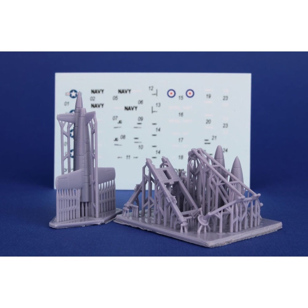 Finely detailed, 3D-printed model of the Chukar target unmanned aerial vehicle, or a drone, that had been developed in the 1960s. To get to the air, the drone used a tripod launcher structure, either ground or vessel based. This tripod is also portrayed in our kit.