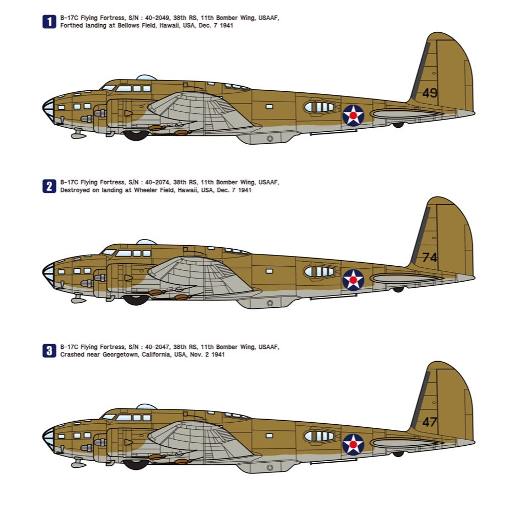 The B-17 is a strategic bomber developed by Boeing. It was known as "The Flying Fortress" because of its strong bulletproof equipment and powerful defensive firearms. This kit uses parts made by Academy, and reproduces a mass-produced B-17B with its engine replaced with a more powerful R-1820-65 engine, with refurbished turrets and self-sealing fuel tanks. Decals for a U.S. Army Air Force aircraft that was used during the attack on Pearl Harbor are included, as is a masking sticker for the canopy.