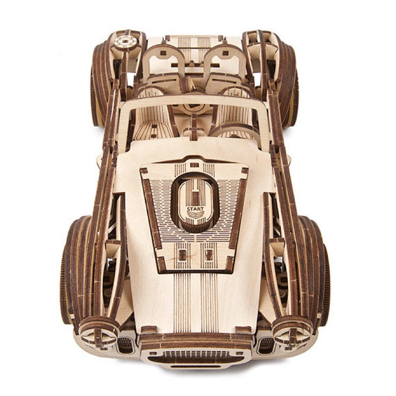 We think this 3D puzzle / DIY model is a beaut, with its fat tires, bulging curves (thanks to pieces that are precision laser-cut into fine 1mm plywood), a big open mouth up front, and open-air convertible design. This wooden car's moving parts include turning front wheels, doors that open, and a hood and trunk that can be raised. Instead of a rubber band motor we've used a powerful spring mechanism to provide the "muscle" in this racer and extend the model's usable life. The ratchet mechanism means you don't have to hold the knob the entire time you're winding the model—potential energy is stored with each twist, without slippage, until the strong internal spring is fully loaded.