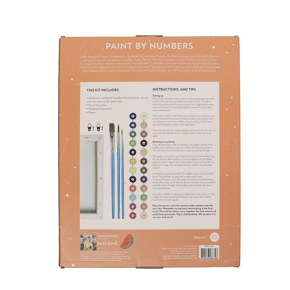 Our kits include a set of 3 premium brushes, 24 pots of acrylic paint, and a 30cm x 40cm wooden and cotton canvas and hanging tools with the appropriate artwork to be painted. Also to make your craft easy and more joyful we have added a printed poster of the original artwork for you to help guide you.