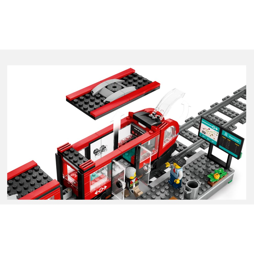 This LEGO® City Downtown Streetcar and Station set is packed with fun features for fans of toy trains and trolley cars.