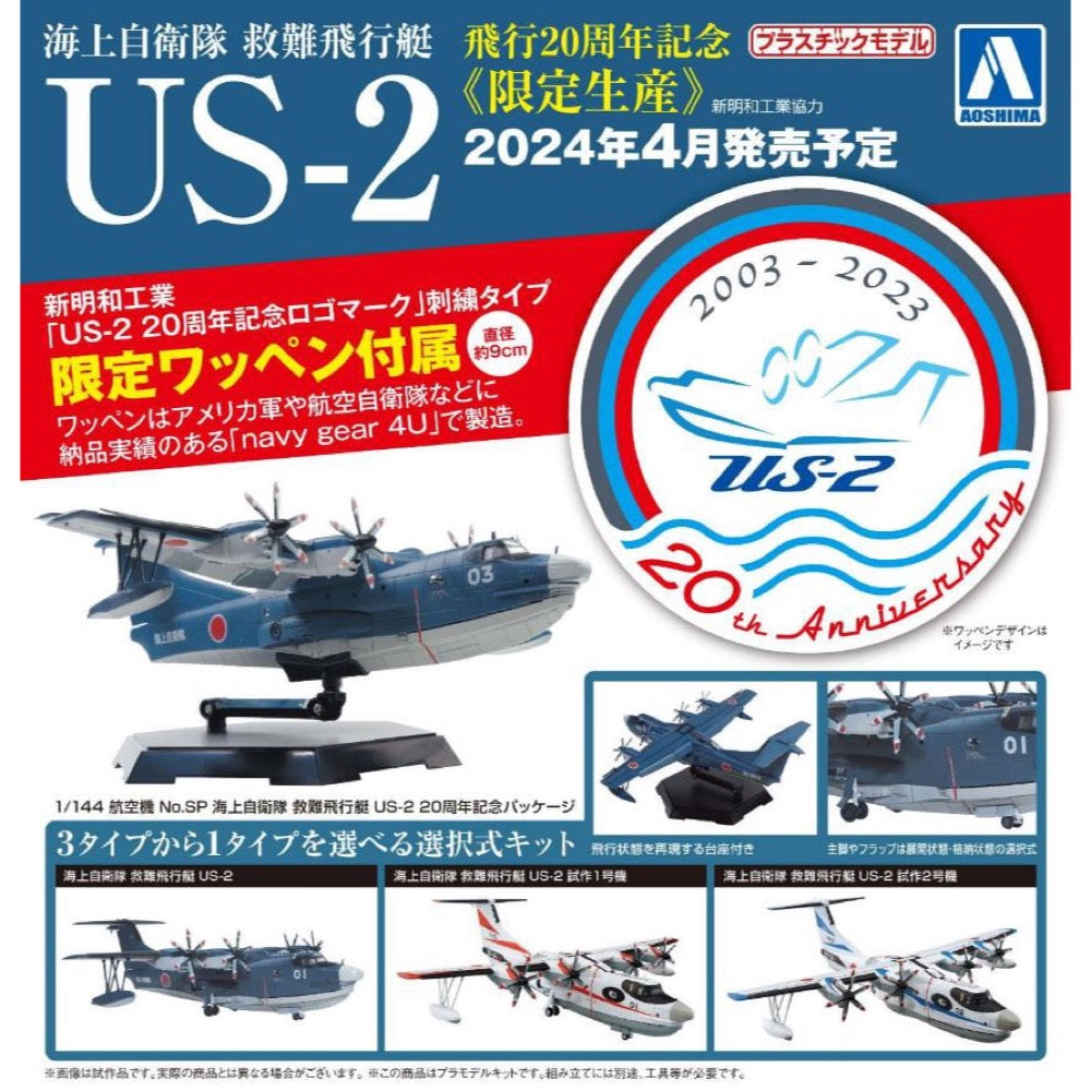 The US-2 is Japan's world-renowned high-performance flying boat. To commemorate the 20 years since the first flight of the prototype US-1A Kai, Aoshima's 1/144-scale aircraft series will be releasing a limited-edition US-2 with luxurious benefits! The bonus includes an embroidered patch (9cm x 9cm) with the 20th anniversary logo mark (ShinMaywa Industrial Cooperation), manufactured by Navy Gear 4U, which delivers to both the U.S. military and the Japan Air Self-Defense Force. In addition, the kit can be made as one of three types: US-2, US-1A modified prototype No. 1, and US-1A modified prototype No. 2. The main landing gear and flaps can be built deployed or retracted, and a display base is included. The kit honors the 20th anniversaries of both ShinMaywa Industries and the US-2, which has protected the safety of Japan's seas and skies.