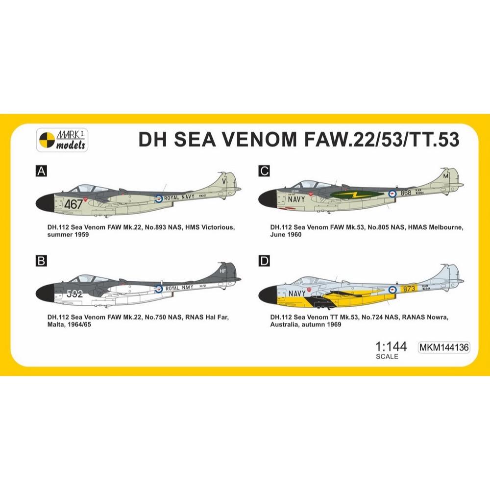The de Havilland Sea Venom was a British jet all-weather fighter developed for the Royal Navy from the RAF's Venom NF.2 night fighter. First flown in April 1951, the Sea Venoms were produced as the FAW.20 (50 a/c), improved FAW.21 (167 a/c) and uprated FAW.22 (39 new built and other Mk.21s converted). In total, 256 aircraft were taken on FAA's charge, while 39 Sea Venoms, designated FAW.53, were delivered to the Royal Australian Navy in 1956.