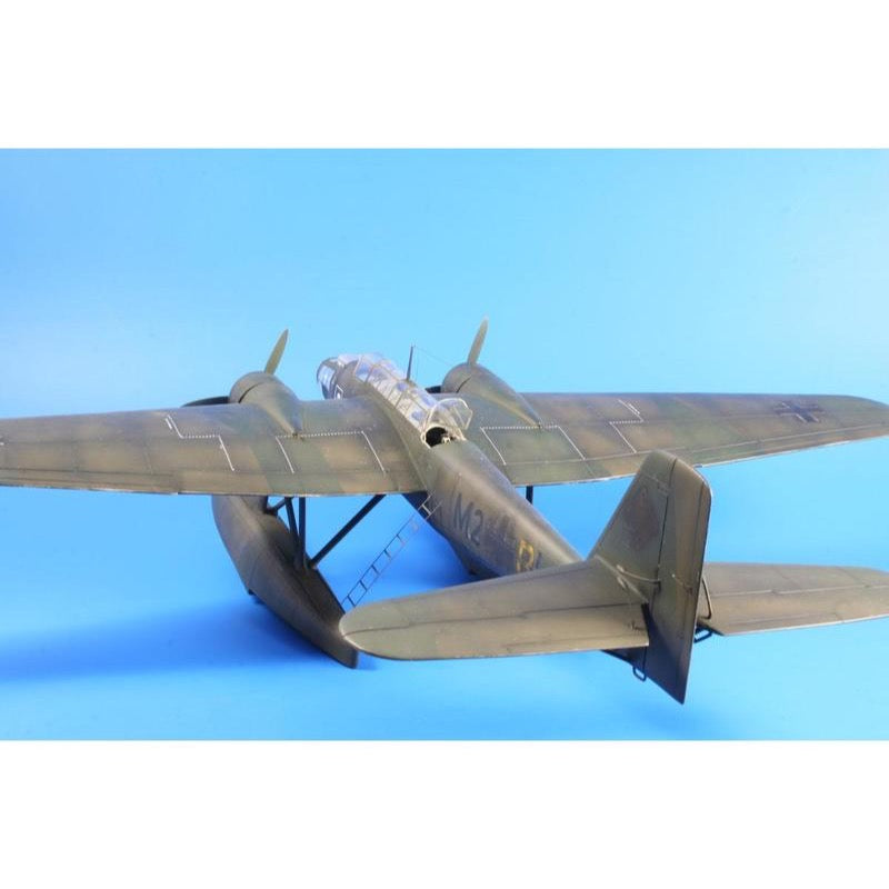 The model also contains resin detail parts and photo etches and the decals cater for three German machines, first of which operated oved the North Sea wearing a camouflage scheme adapted for flying at night. The two more machines were seen over Scandinavia, one of them in a scheme with added white mottles for winter operations.