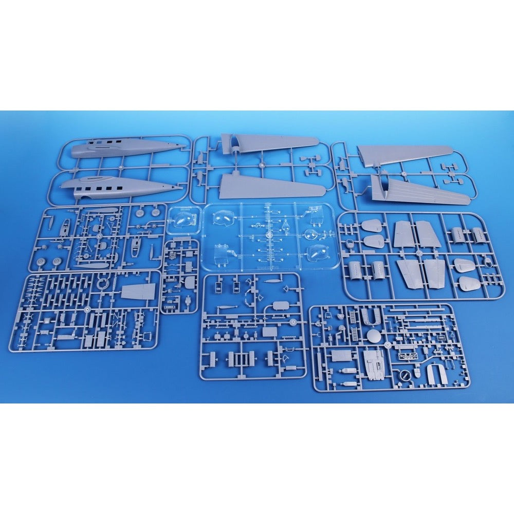 The model kit consists of as many as nine grey styrene sprues, two clear plastic sprues and a sheet of decals covering three Czechoslovak Air Force machines.