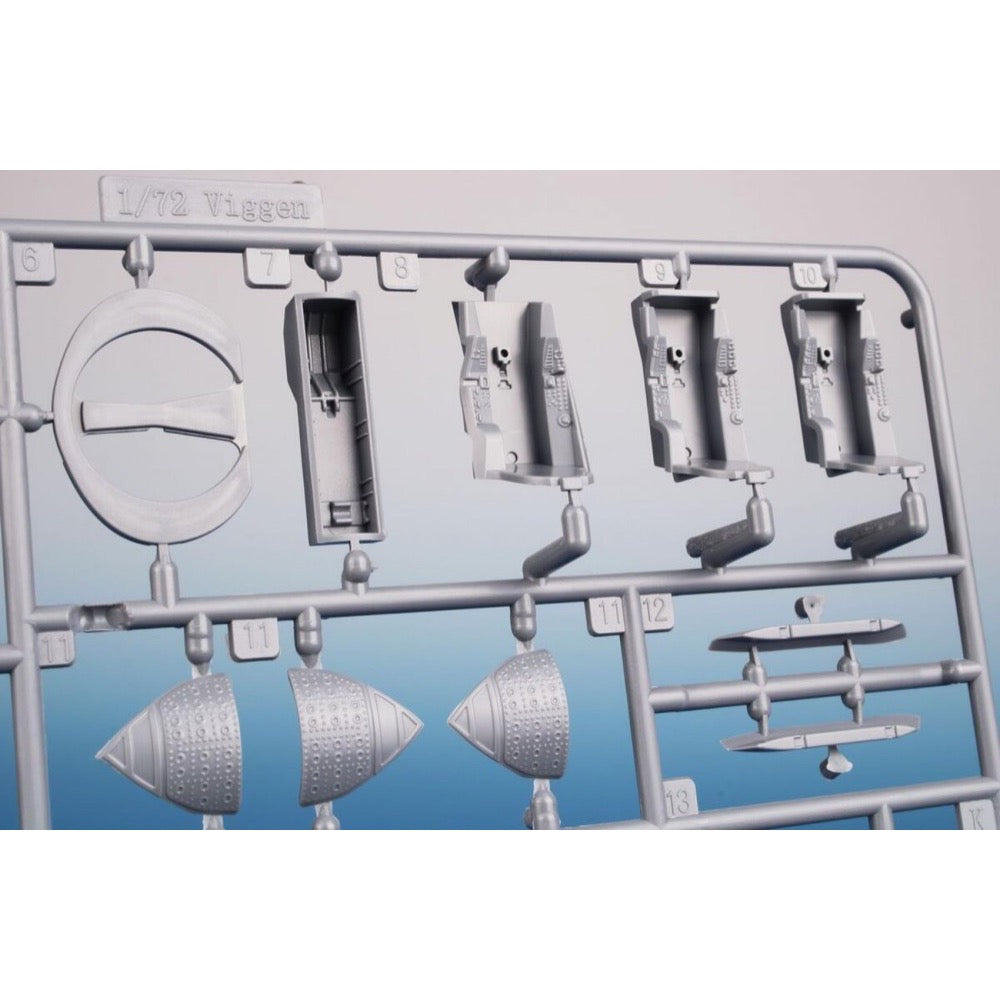 Our SH72381 reboxing of the Viggen offers the SK-37 trainer type. The decals and marking schemes allow you to build three various airframes which cover all three styles of camouflage schemes worn by the Viggen. We have for you a natural metal Viggen, a standard splinter scheme as well as a two-grey machine