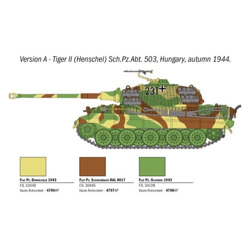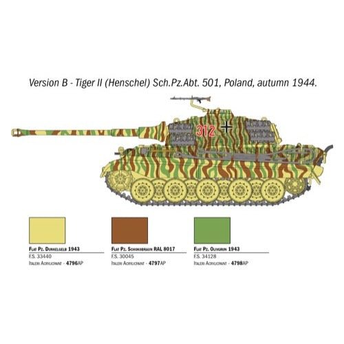 The heavy tank Sd.Kfz 182 Panzer VI Ausf. B "King Tiger" came into service with the German army since mid 1944. Compared to its predecessor, the Tiger I, several differences and improvements have been adopted : a completely new chassis, a stronger armor characterized by the sloped frontal hull (bringing to a total weight of almost 70 tons) and the lethal 8.8 cm KwK 43 L/71 gun as main armament. Thanks to its Mayback V-12 engine the King Tiger was able to reach the maximum speed of 42 Km/h. For the mass production two different turret solutions has been used : the Porsche turret, at the beginning, and the Henschel turret for the most of the units produced. Both ot them were able to load 80 rounds for the main cannon. The first combat use of the King Tiger was by the 503rd Heavy Panzer Battalion during the Battle of Normandy on July 1944.
