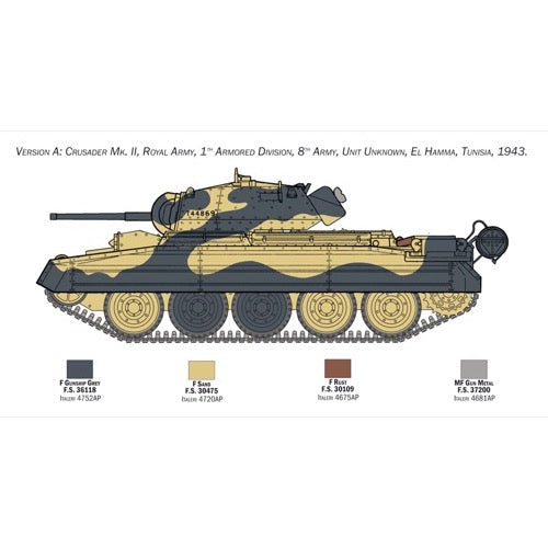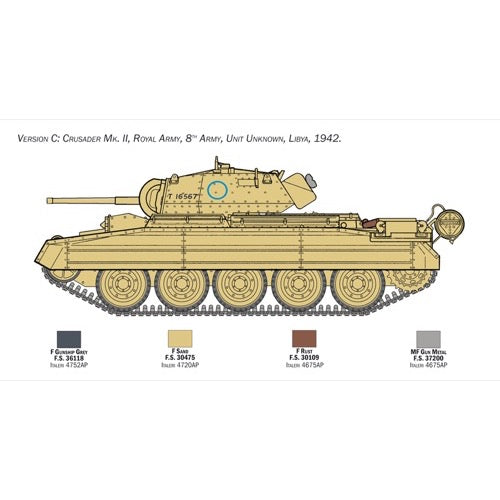 Designed at the beginning of the Second World War, the Crusader was one of the most important British "Cruiser" tanks reaching a production of over 5,000 units. Equipped with Christie suspension with large diameter rolling wheels, the Crusader possessed remarkable driving skills on rough terrain. The first versions of Mk. I and Mk. II were armed with a 2 pdr. cannon, later replaced by the more powerful 6 pdr. cannon in the Mk.III version. Lacking adequate armor against enemy fire, it was also very vulnerable to enemy mines and anti-tank guns, and its armament was often inadequate in front of similar German vehicles. However, when used in a coordinated way, they managed to achieve good results. The Crusaders Mk. II, with the arrival of the more powerful Mk.III, were already relegated to second-line duties at the time of the battle of El Alamein.
