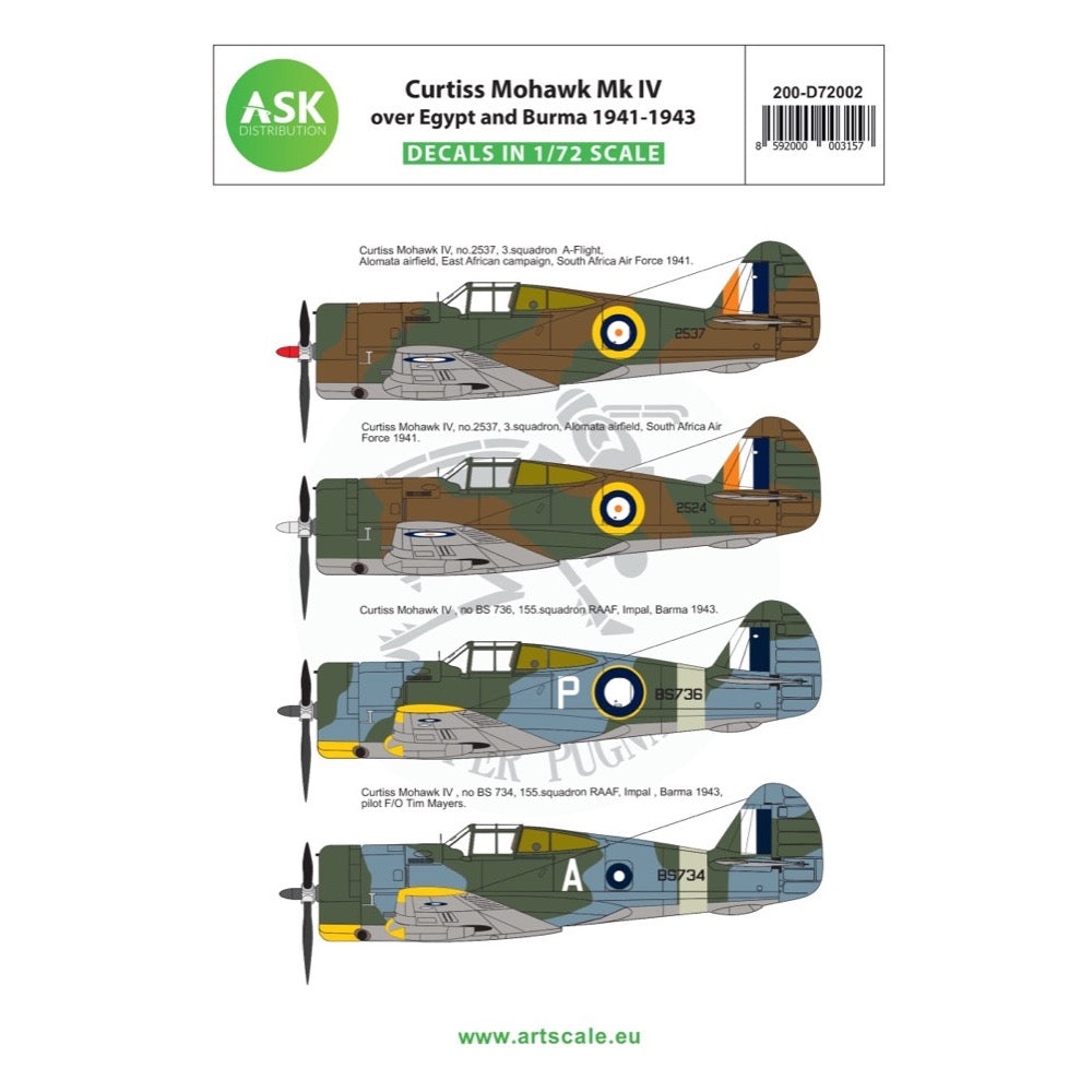 Art Scale D72002 1/72 Curtiss Mohawk IV Over Egypt And Burma 1941-1943 Decal Set