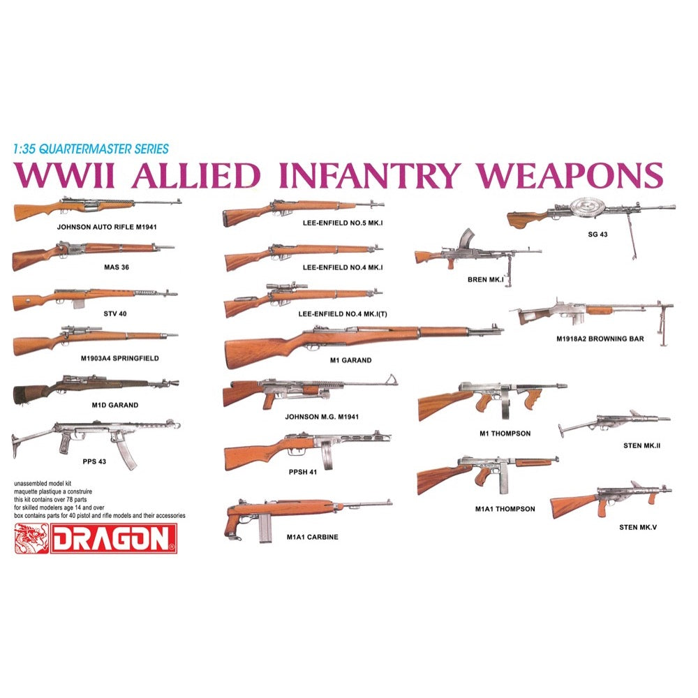 Very sharp, clean tooling comes with two of each of the M1918A2, M1941, Bren Mk.I, SG43, PPS43, STV40, Mo.5 Mk.I, No.4 Mk.I(T), No.4 Mk.I., M1A1, M1941, M1D, MAS36, PPSH41, M1, M1A1 Thompson, Sten Mk.II, M1903A4, Sten Mk.V.