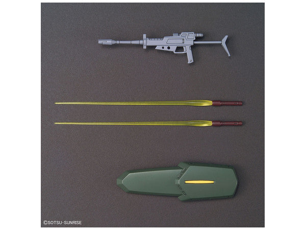 This kit includes a newly-molded version of the Gelgoog rifle, and features a sliding gimmick for the shield.