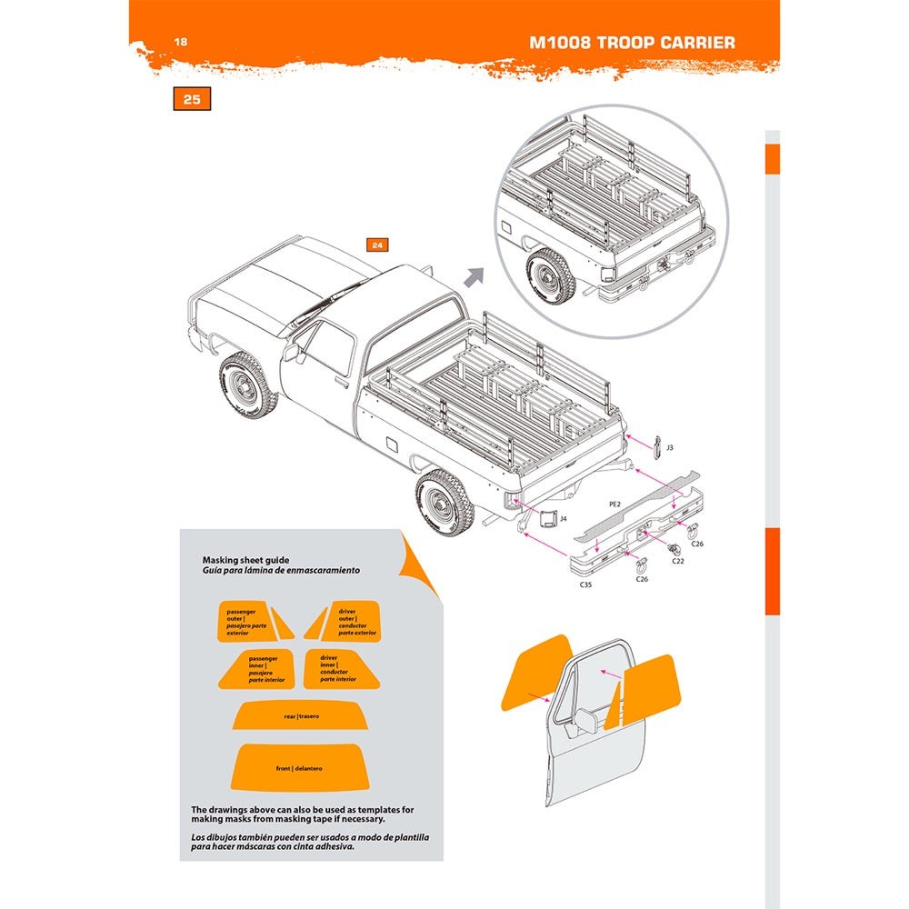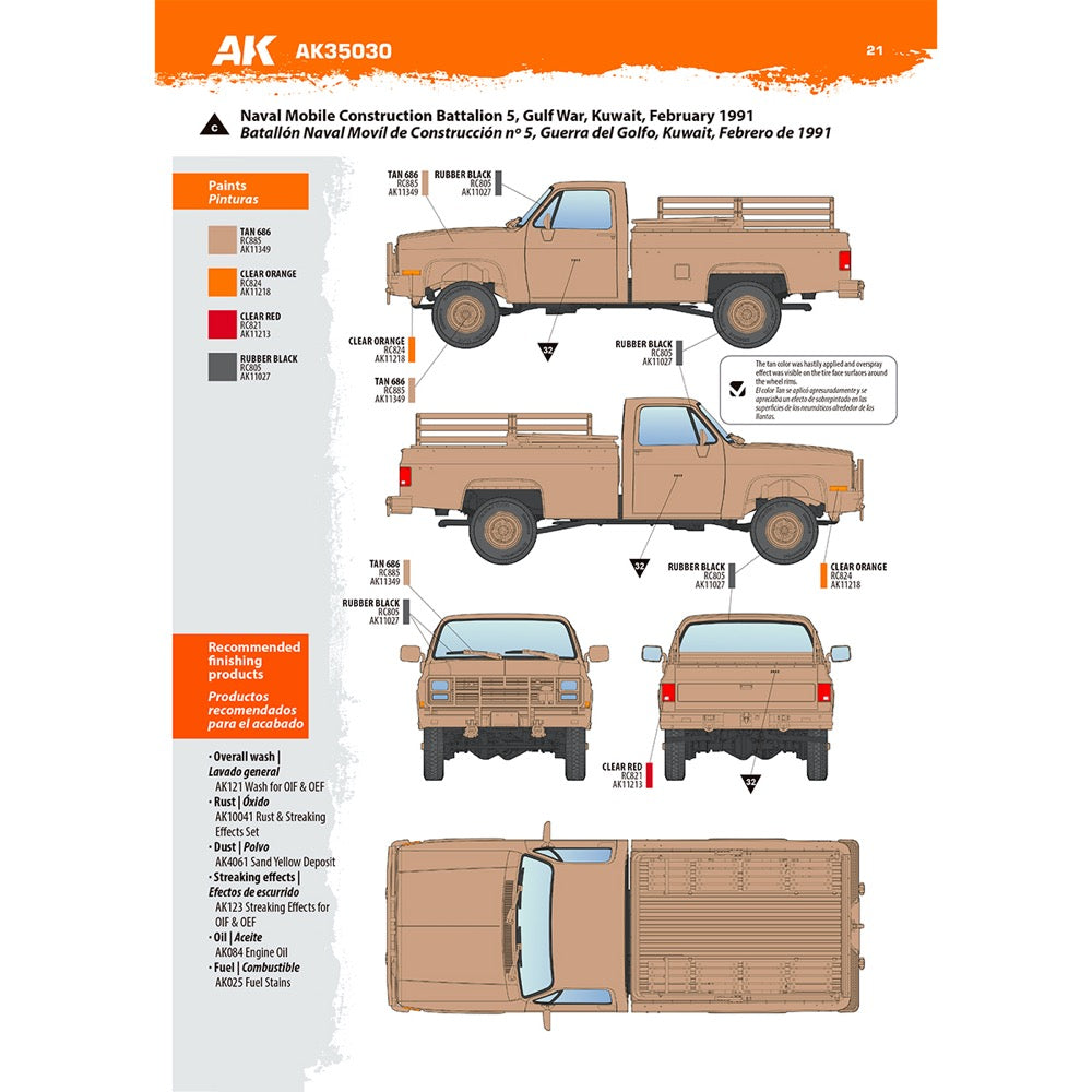 The reference AK35030 represents the basic cargo truck version of the vehicle fitted with troop seats in the bed which may be assembled in folded or unfolded position. The tail gate can also be fixed as folded or unfolded, or remain movable. The decal sheet contains markings for two US Army, two US Navy and one SFOR vehicle, each of them carrying a different overall color or camouflage pattern.