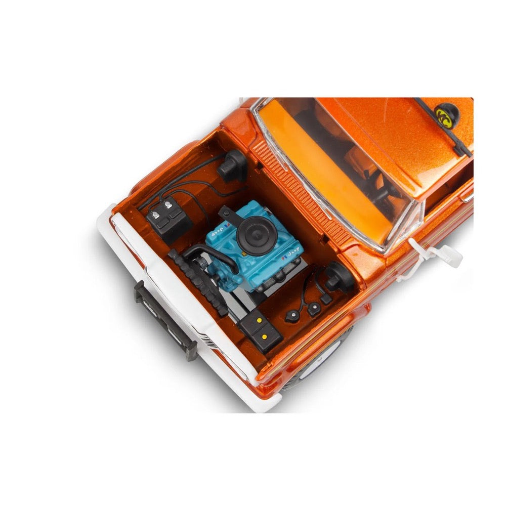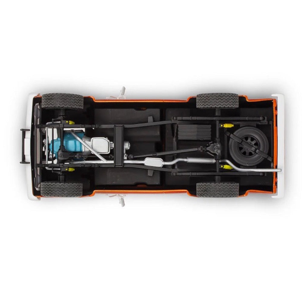 Revell's 1:24 scale 1979 Jeep J-10 Pickup model kit brings this rugged four-wheel-drive pickup to life with 124 parts, featuring an opening hood that reveals a detailed AMC 360 V-8 engine and a separately molded frame with running gear. Optional accessories include a CB radio antenna, bed-mounted roll bar, roof light bar, two grille guard options, jerry cans, toolbox, and a clear-window custom camper topper. The all-new decal sheet offers factory-correct 10-4 graphics and additional detail markings. Molded in white and clear with soft black tires, paint and glue are required to complete this off-road icon.