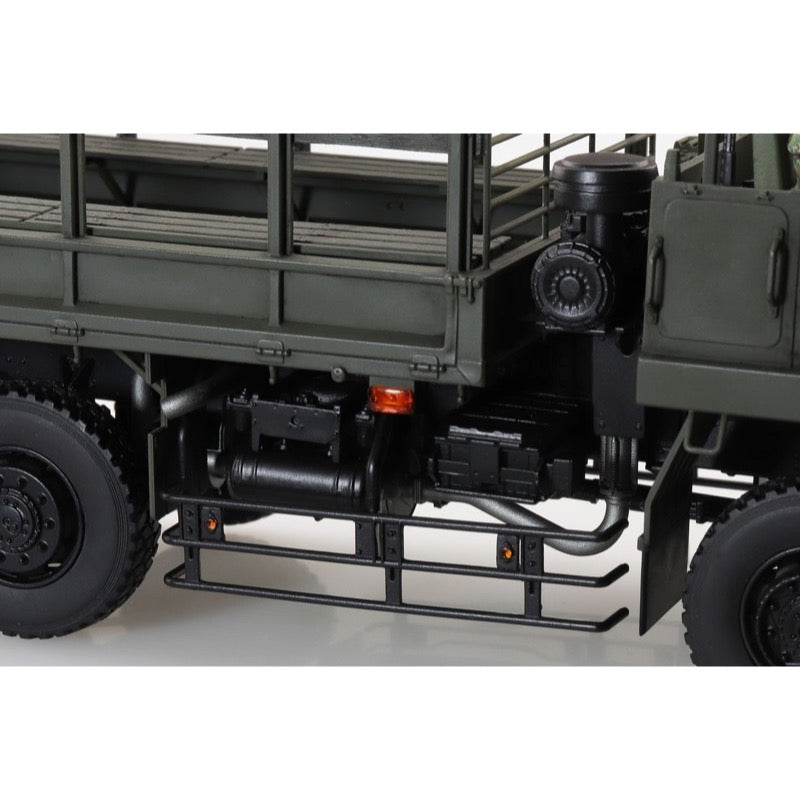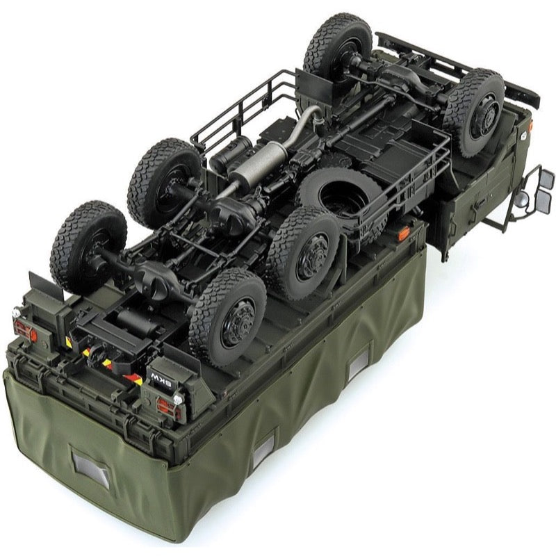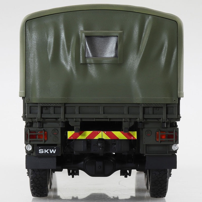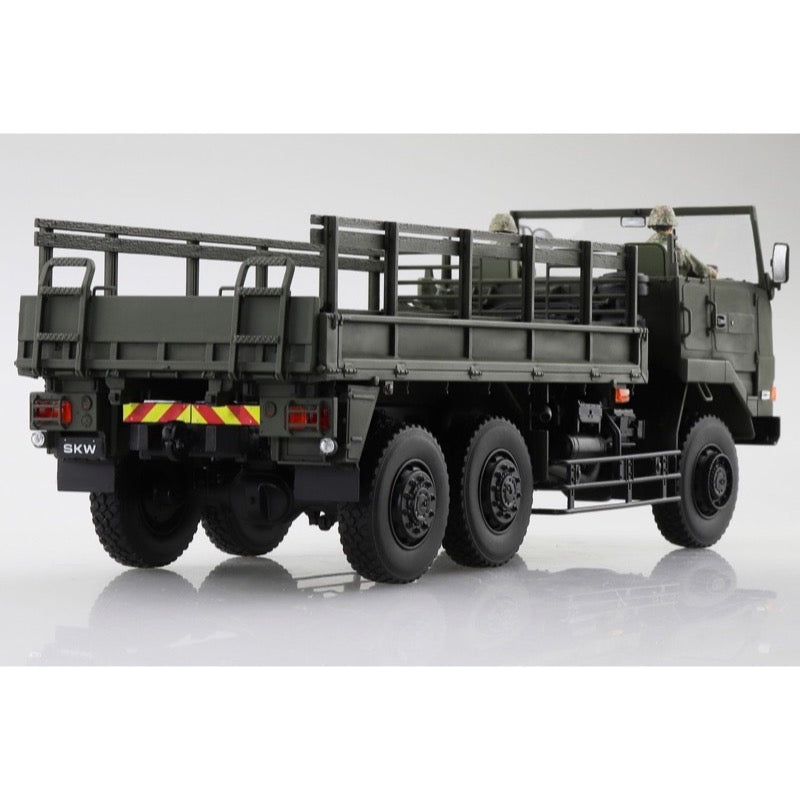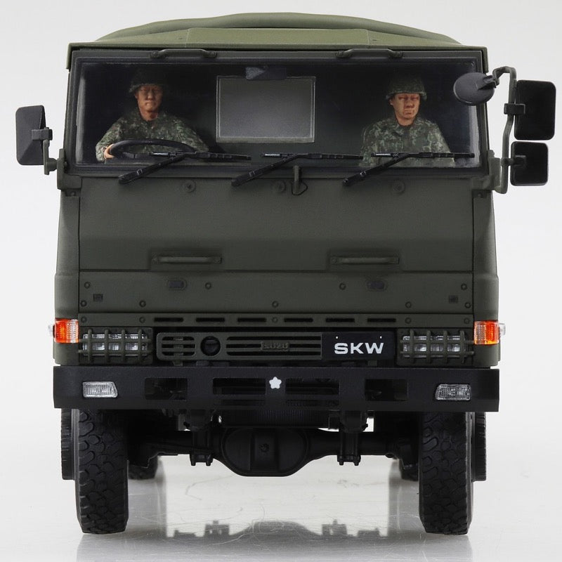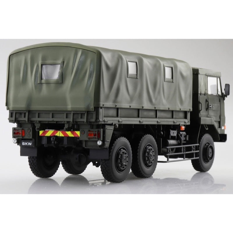 This kit from Aoshima precisely reproduces the SKW-477 3-1/2-ton truck, with movable front-wheel steering and movable rear axles; it can be assembled with the cab and hood in place or removed. Clear parts are used for the lights and reflectors, and rubber radial tires are included, as are a commander figure and a driver figure.