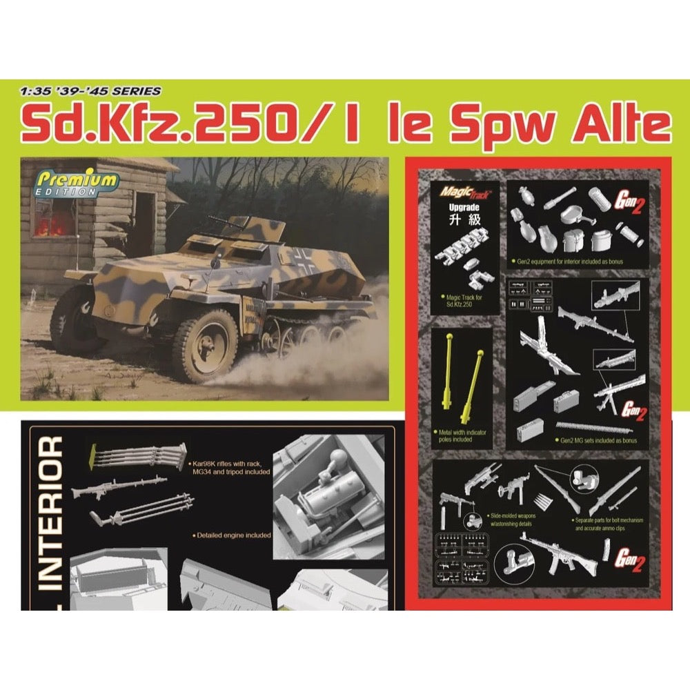 Dragon 6557 Sd.Kfz.250/1 le SPW Alte in 1/35 scale is a model of a German light armored fighting vehicle of World War II. Built on the chassis of the Sd.Kfz.250, this model presents a distinctive version of the "Alte" (old) model of the vehicle.