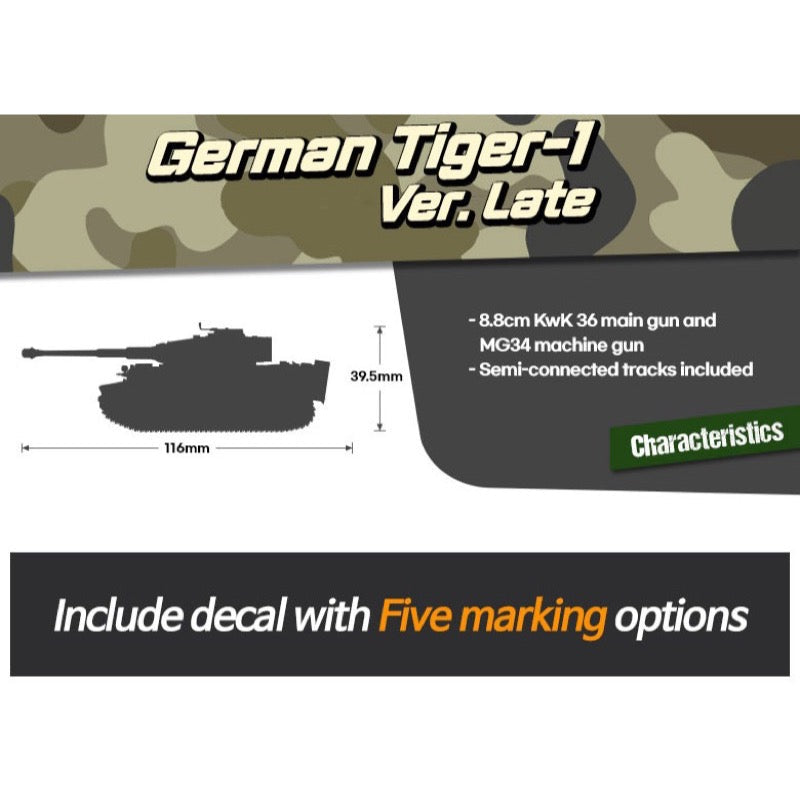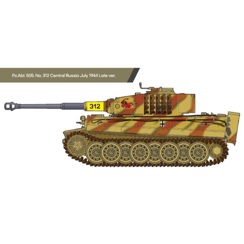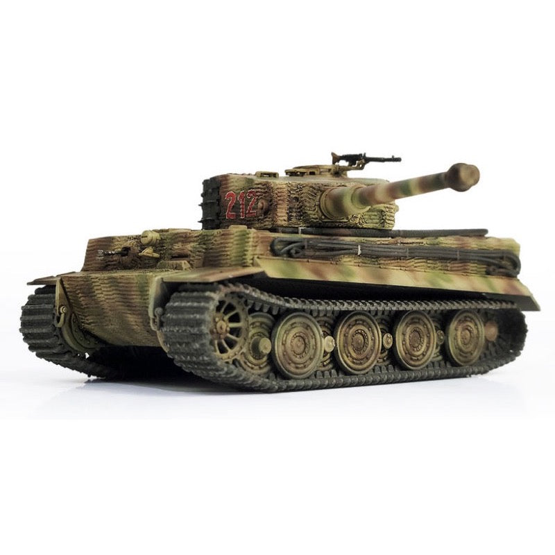 The Pz.Kpfw VI (Sd.Kfz.181) Tiger is a German heavy tank from World War II, one of the most famous combat vehicles of that time. The German Panzerwaffe command had been carrying around the idea of a heavy tank since the beginning of the war, but the first attempts in the form of the Neubaufahrzeuge multi-tank were unsuccessful. In 1939 and 1940 they were conducted ineffectively, but after the clash with the T-34 and KW-1 on the eastern front, work on the new heavy tank sped up. On April 20, 1942, the prototype of the new tank, under the designation VK 4501 (H), underwent field trials in the presence of Adolf Hitler and was put into mass production shortly after. The first production versions were designated Pz.Kpfw VI Ausf.H1 (later Ausf.E). In the course of production, in the years 1942-1945, the tank was systematically modified by, for example, adding Feifell dust filters, different placement of headlights, modernization of optical equipment, changes to the commander's turret, etc.