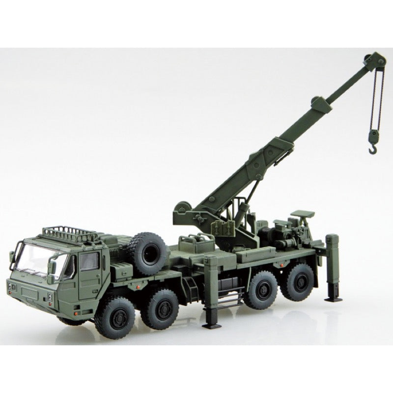 The JGSDF Heavy Wheel Recovery Vehicle is a state-of-the-art machine with improved winch capability, suspension towing capability, and track performance. It's outfitted with a crane to handle the most tricky recoveries with ease. After completion, the crane can be extended, moved up and down, and swiveled, and the installation outrigger is movable.