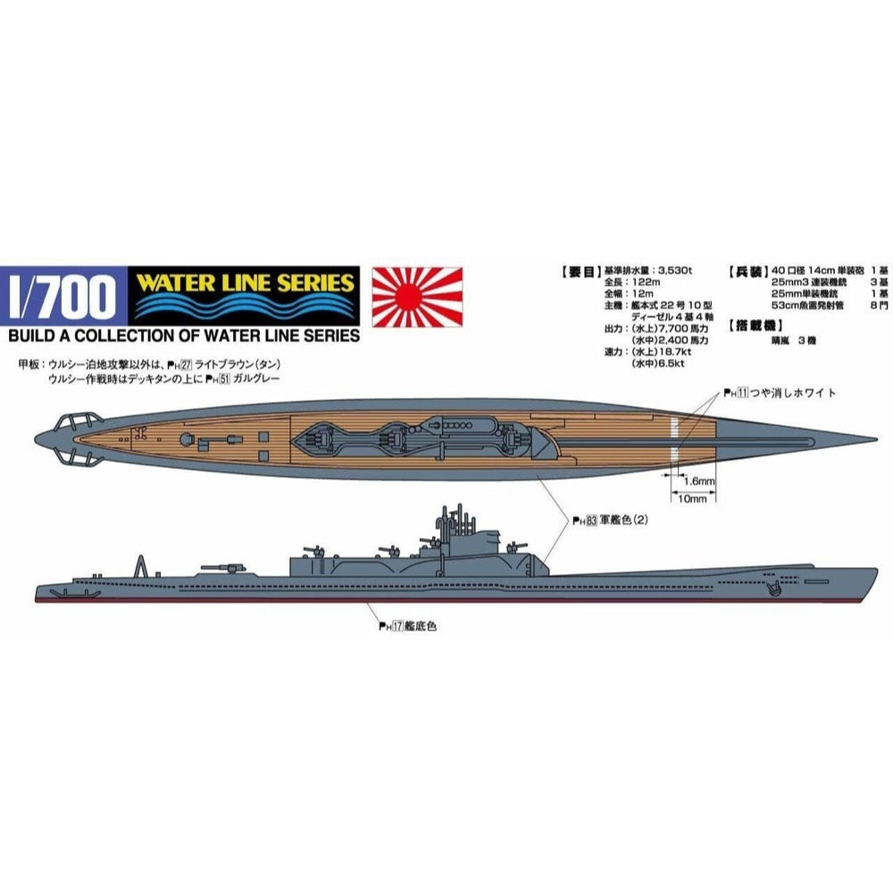 This is an Aoshima 1/700 scale (Approximate length: 174mm, beam: 17mm) assembly and painting required plastic model kit of the Imperial Japanese Navy Sen Toku I-400-class submarine, the largest submarines of World War II. Model kit features: Waterline hull model. 2x onboard Aichi M6A Seiran seaplane included. Realistic onboard weapons and accessories. Illustrated instruction sheet and decals included.
