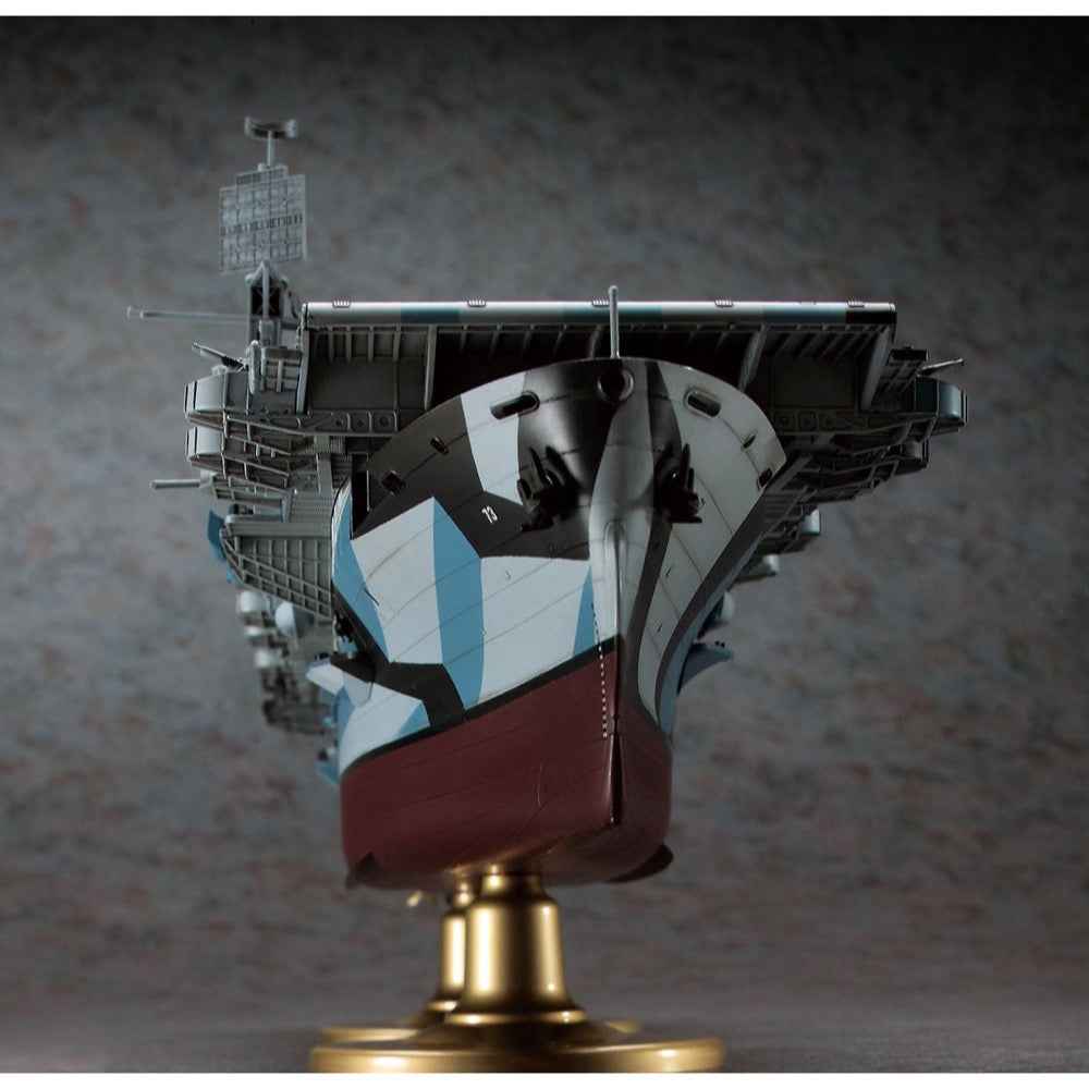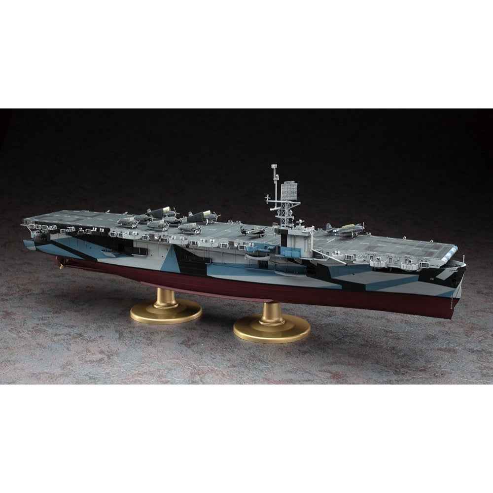 Hasegawa's magnificent model of the US Navy escort carrier USS Gambier Bay depicts the ship as it appeared during the Battle of Leyte Gulf in October of 1944. Includes three Avengers and six Wildcats, all with positionable folding wings. Also includes a 13-page pamphlet all about the ship, with b&w photos and text in both Japanese and English. The 19-page instruction manual also features both Japanese and English, and includes a page of cut-out masks you can use to help paint the striking camouflage pattern the Gambier Bay wore.