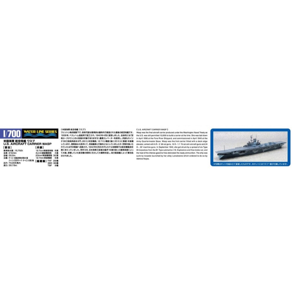 Wasp was the final aircraft carrier produced under the Washington Naval Treaty as the U.S. was still permitted 15,000t to build a carrier at the time. She was laid down in April 1936 at the Fore River Shipyard, and commissioned in April 1940 at the Army Quatermaster Base. Wasp was the first carrier fitted with a deck edge elevator, armed with 8 A~ 5' 38 cal guns, 16 A~ 1.1' 75 cal anti-aircraft guns, and 24 A~ .50' machine guns. In September 1942, she got struck by a spread of six Type 95 torpedos from the B1 Type submarine I-19. Explosions and fires broke out, and the heat of the intense gasoline fires detonated the ready ammunition. The ship was sunk by a torpedo launched by her alley Lansdown, which was ordered to do so by Admiral Noyes.