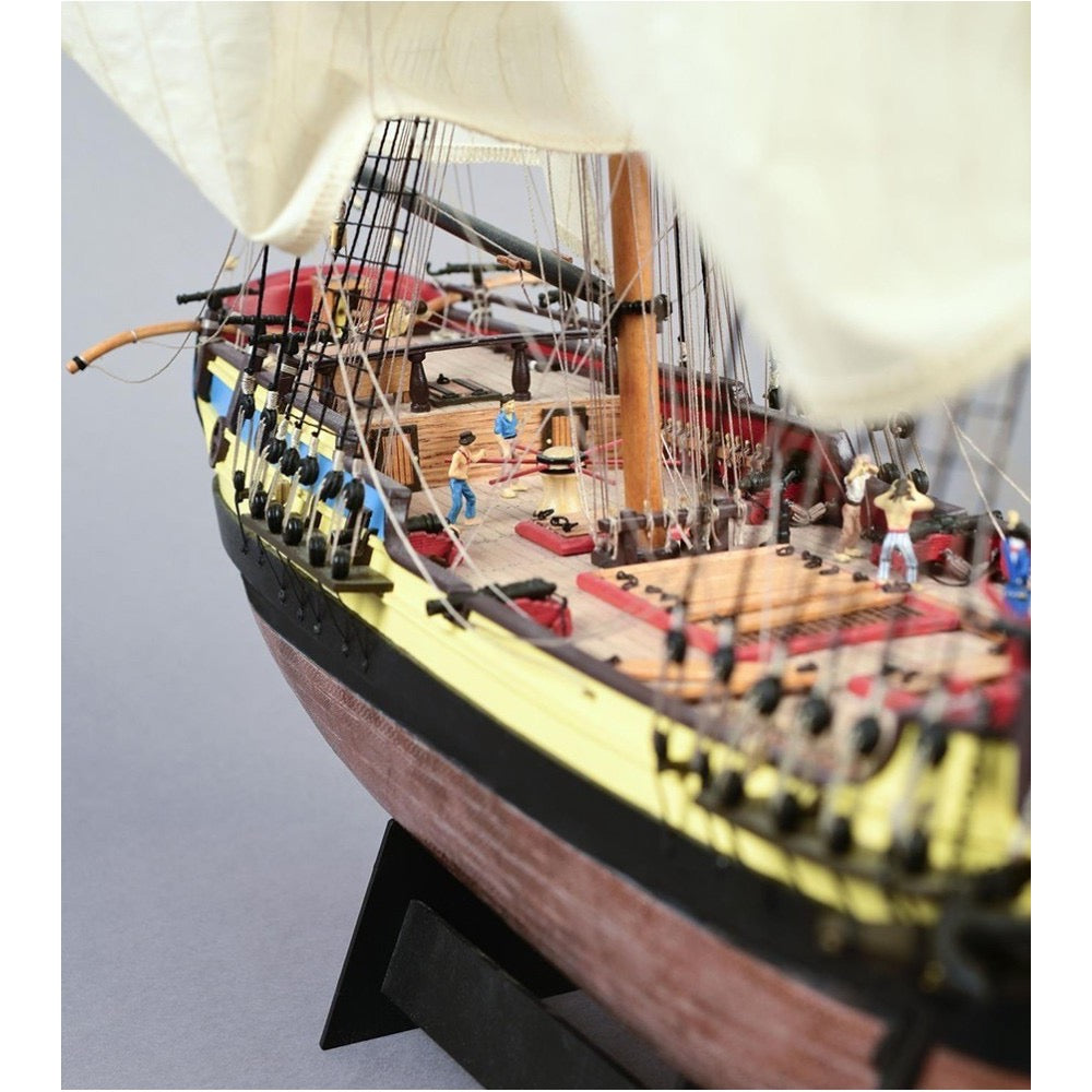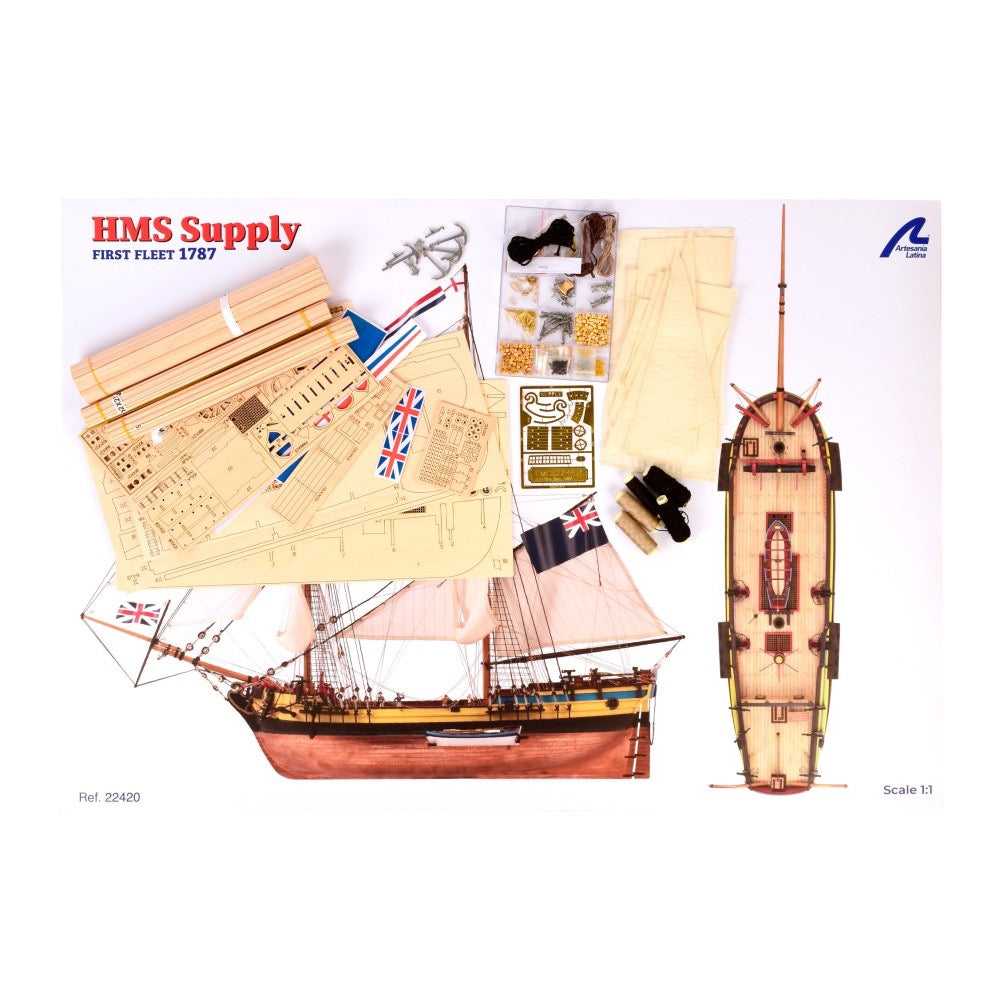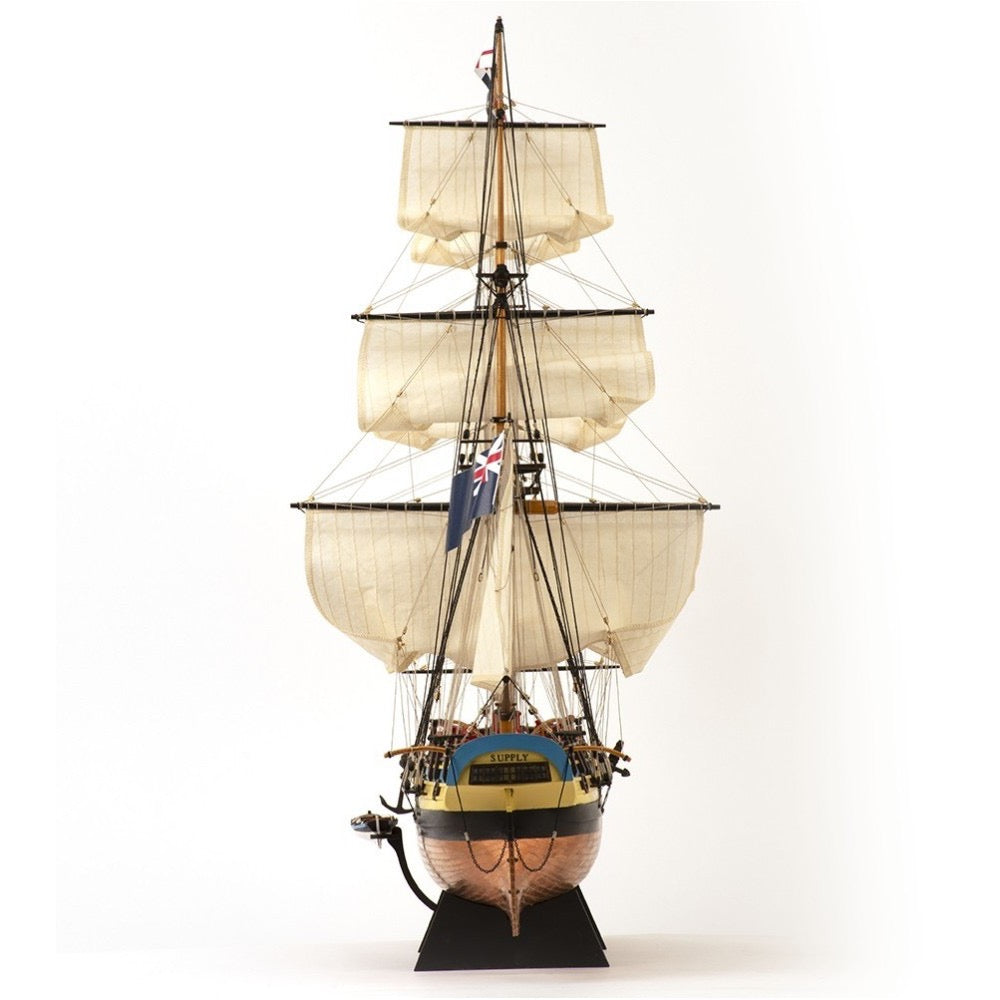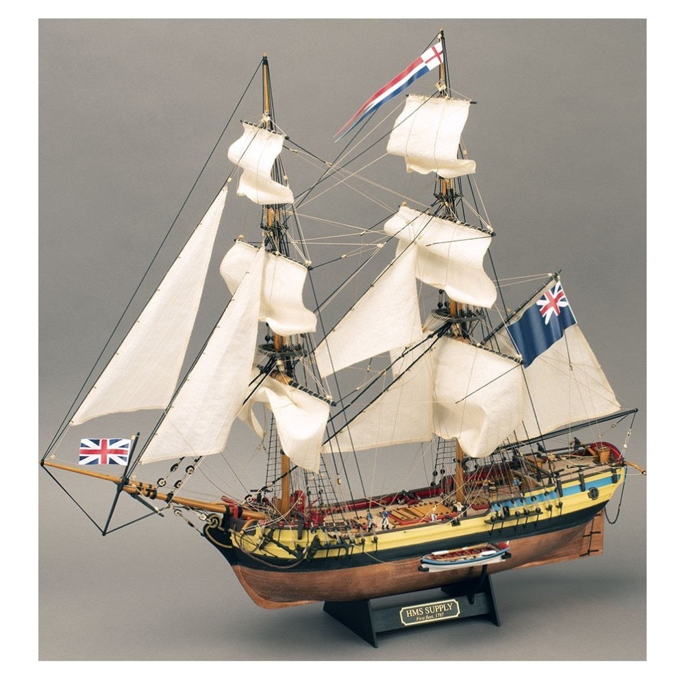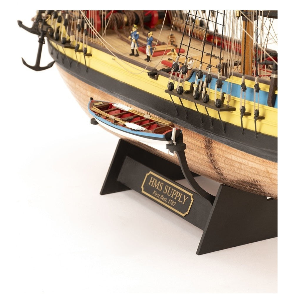 Get passionate about building this 2024 reissue of the wooden model of the 18th century British ship , brig sailing ship category , called HMS Supply at 1:50 scale . It is a legendary armed ship as it participated in the founding of Australia as a country by establishing a colony. The fastest of the well-known First Fleet . Aimed at modelers with an intermediate level of skills.
