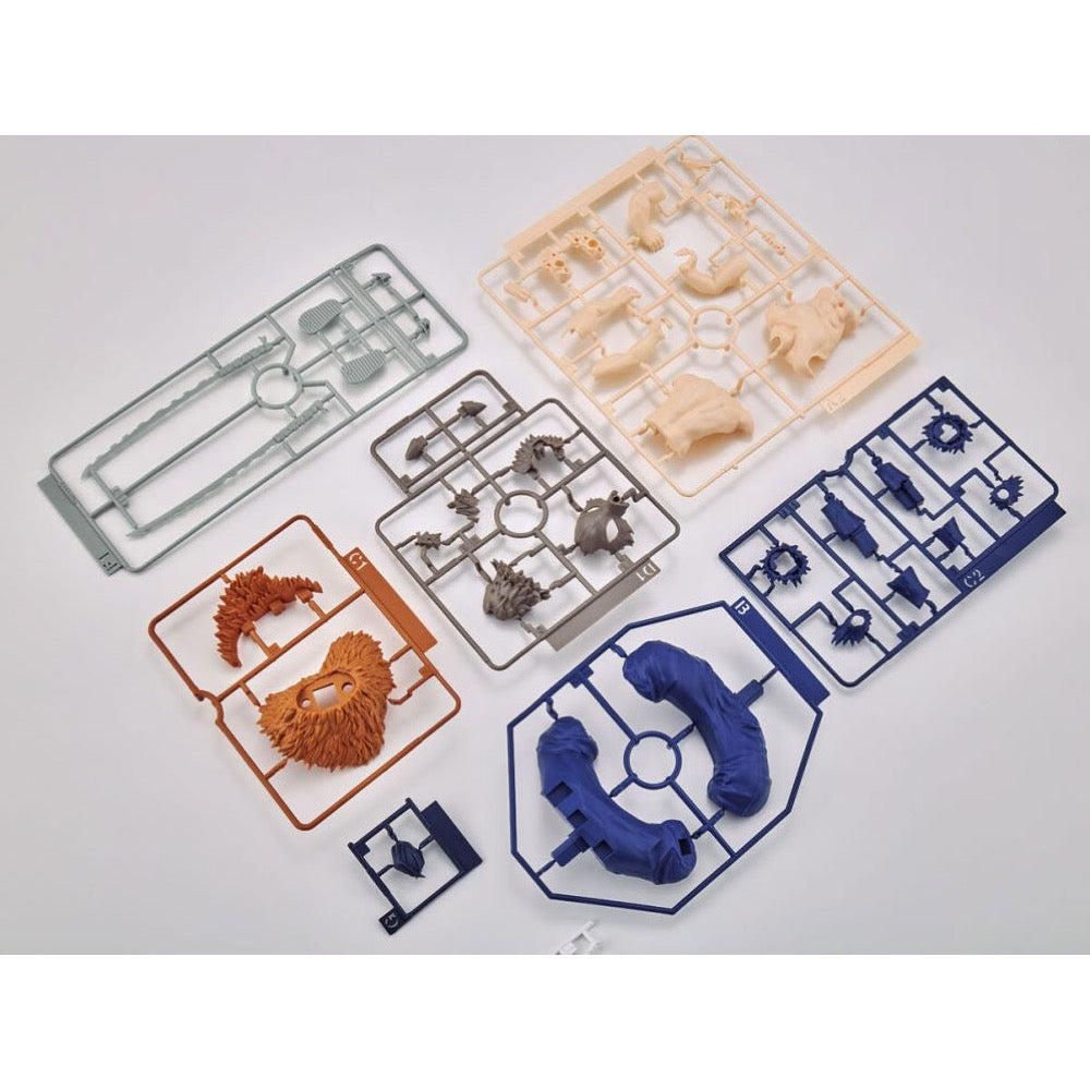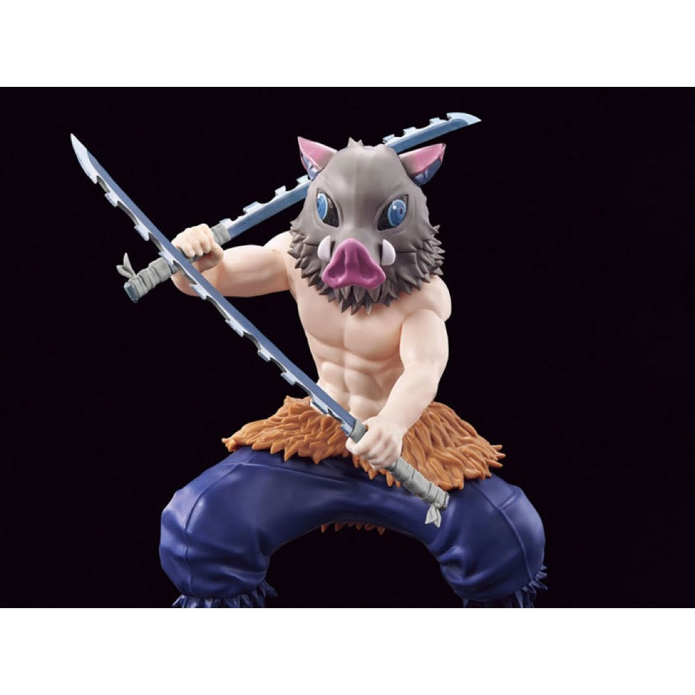 Inosuke Hashibira from "Demon Slayer: Kimetsu no Yaiba" is now a model kit from Bandai that combines easy assembly with high quality! An interchangeable head is included without his boar's head mask, with tampo-printed eyes and eyebrows; the boar's eyes and ears are stickers, and the nose is painted. The fluttering ends of his hair are made with pre-painted parts; the blade of his distinctive Nichirin sword is also reproduced with care. High-quality sculpting highlights his muscles and fur, too!