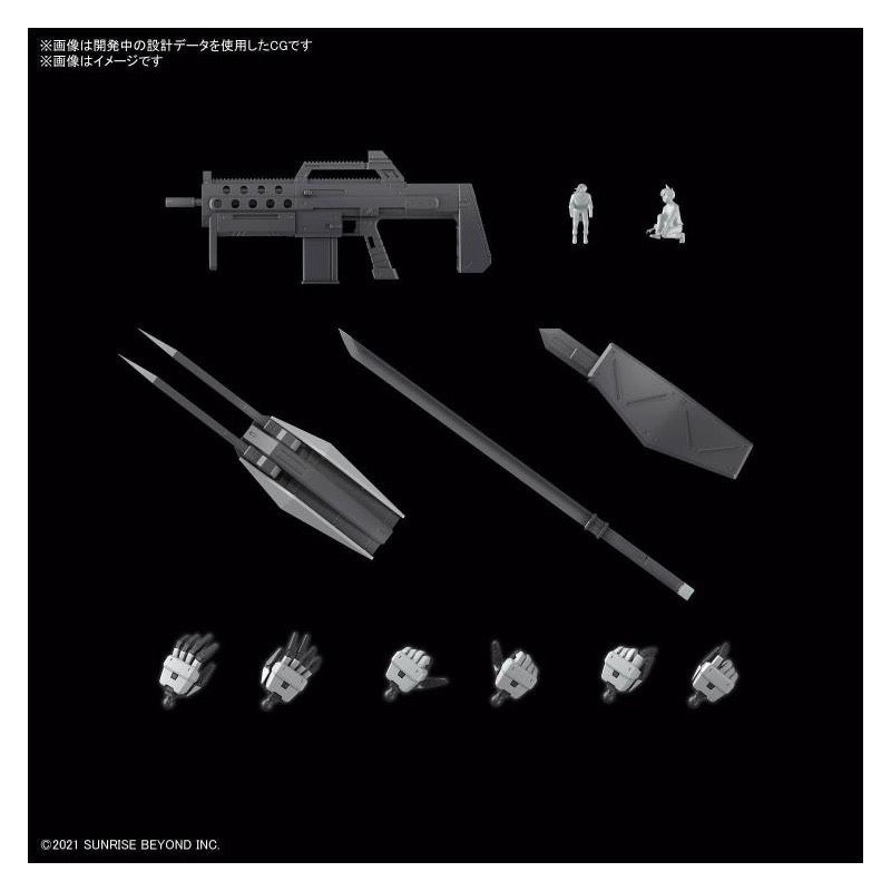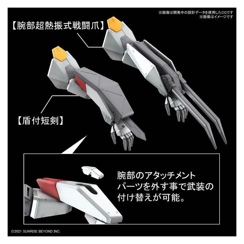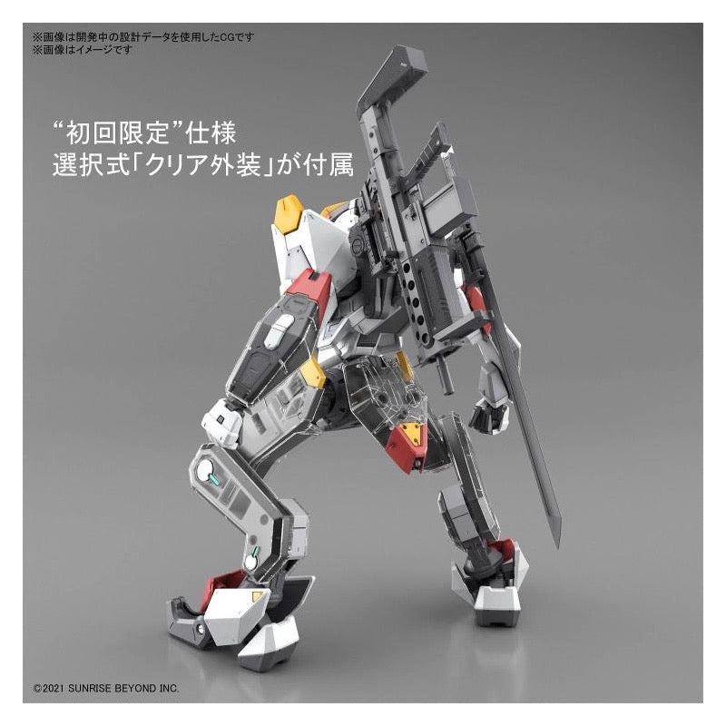 This intriguingly designed robot will be fully posable after assembly; its arm-mounted Super Heat Swing Type Battle Claw and dagger with shield can be attached with parts replacement. The specially structured legs are posable enough so that the knee armor can touch the ground in kneeling poses! Its portable cannon is partially textured to express the high-density details of its surface; figures of Amou Shiiba in both standing and seated poses are included. In addition, this first-production special item comes with clear outer parts so you can admire the details of the inner frame after assembly!