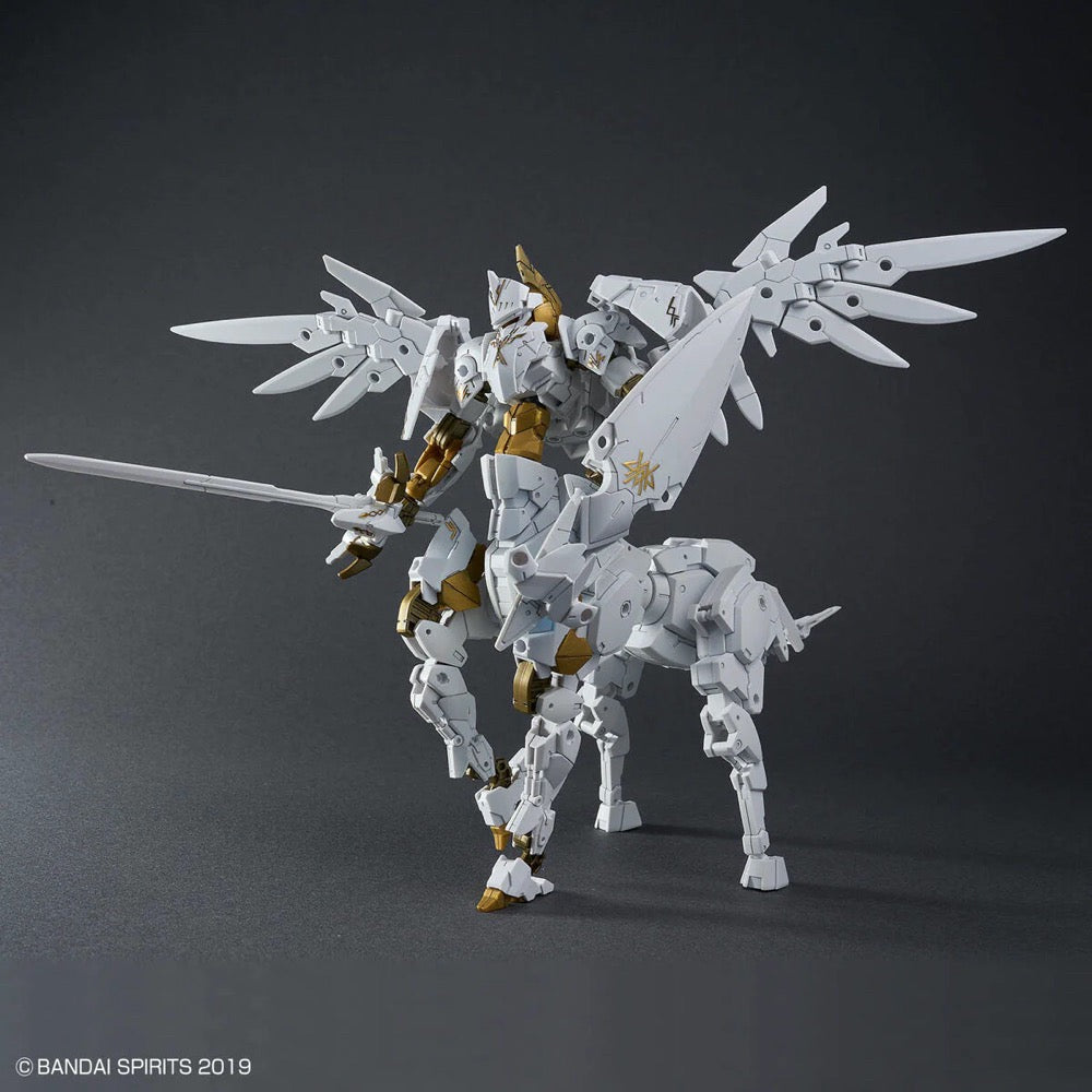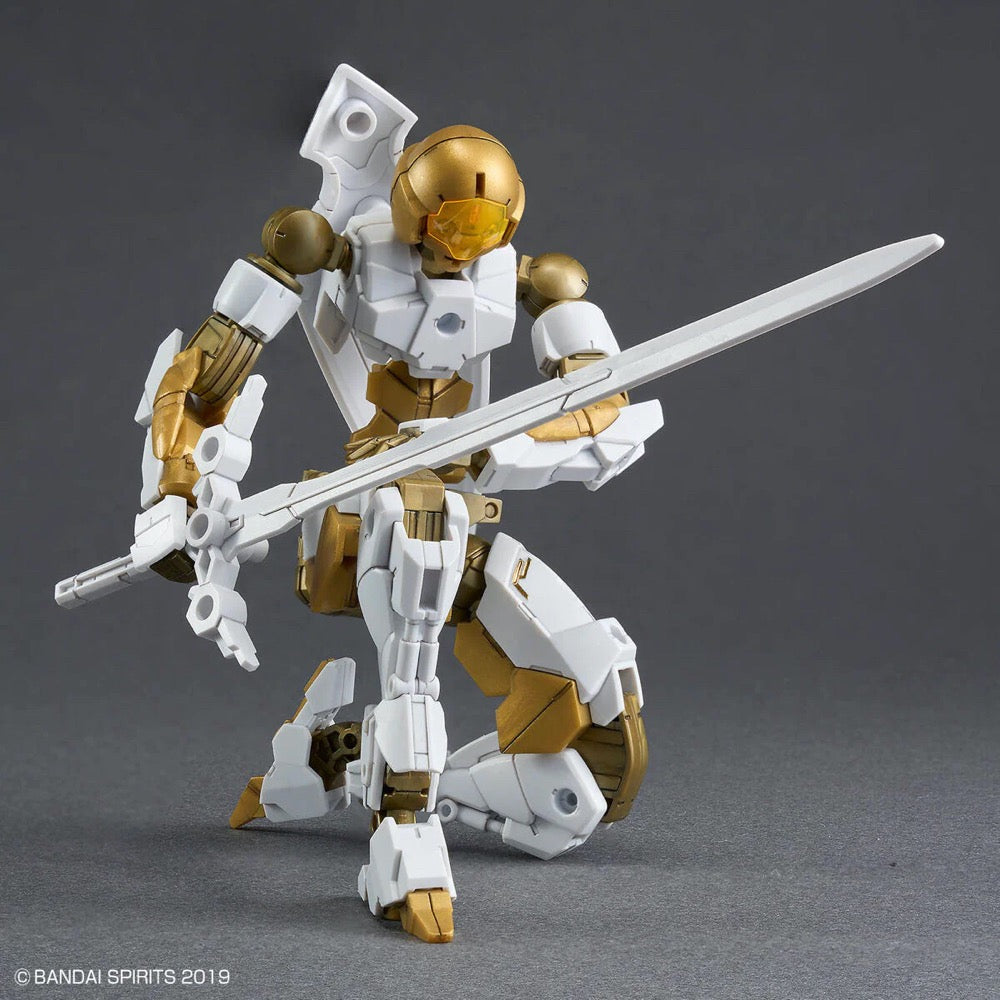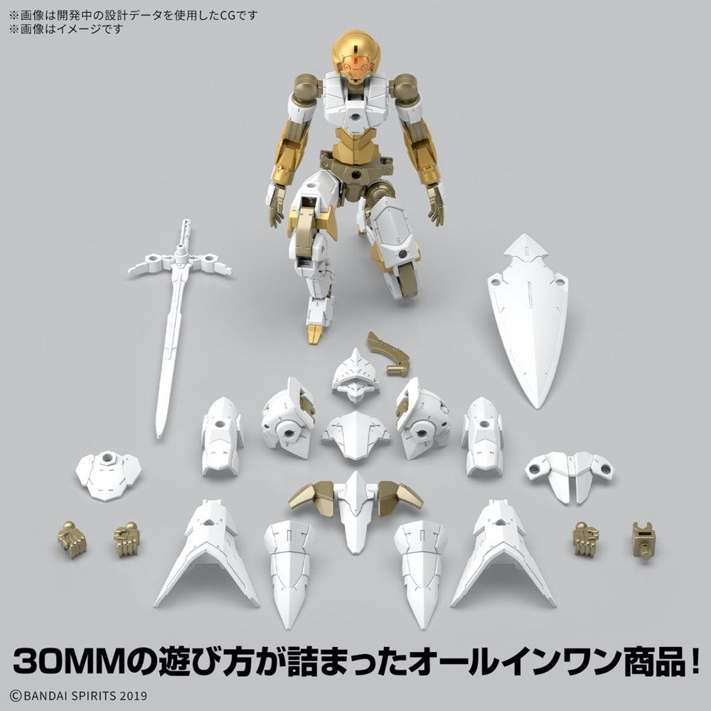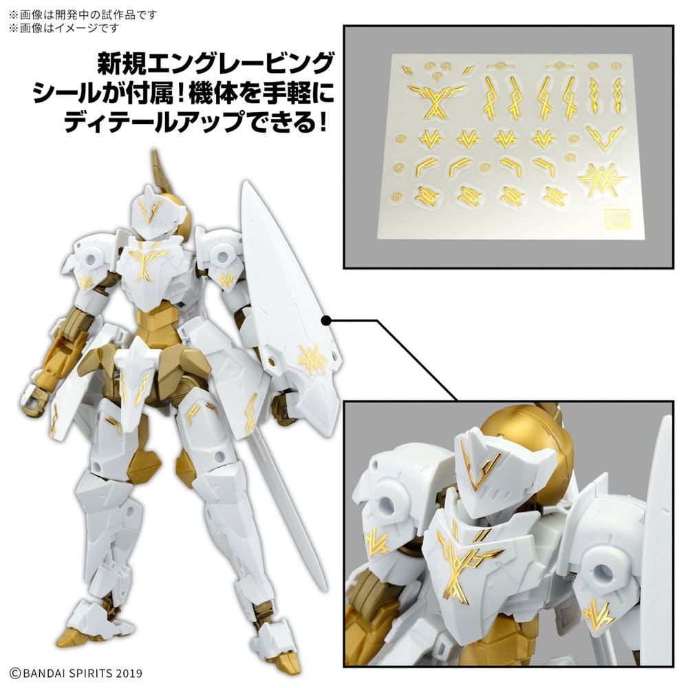 The Spinatio (Royal Knight Type) features gleaming golden accents on a white base! This is an all-in-one item that includes the main body, armor parts, and weapon parts. While taking advantage of the range of motion, there is no pinching during assembly. Weapons and armor unique to the Royal Knight specification are included; armor parts such as the head visor are removable. The Knight Sword can be stored in the shield and attached to the back; shields can be attached to other 30MM series units by using the included grip parts. New engraving stickers are also included so you can easily add details to your unit!