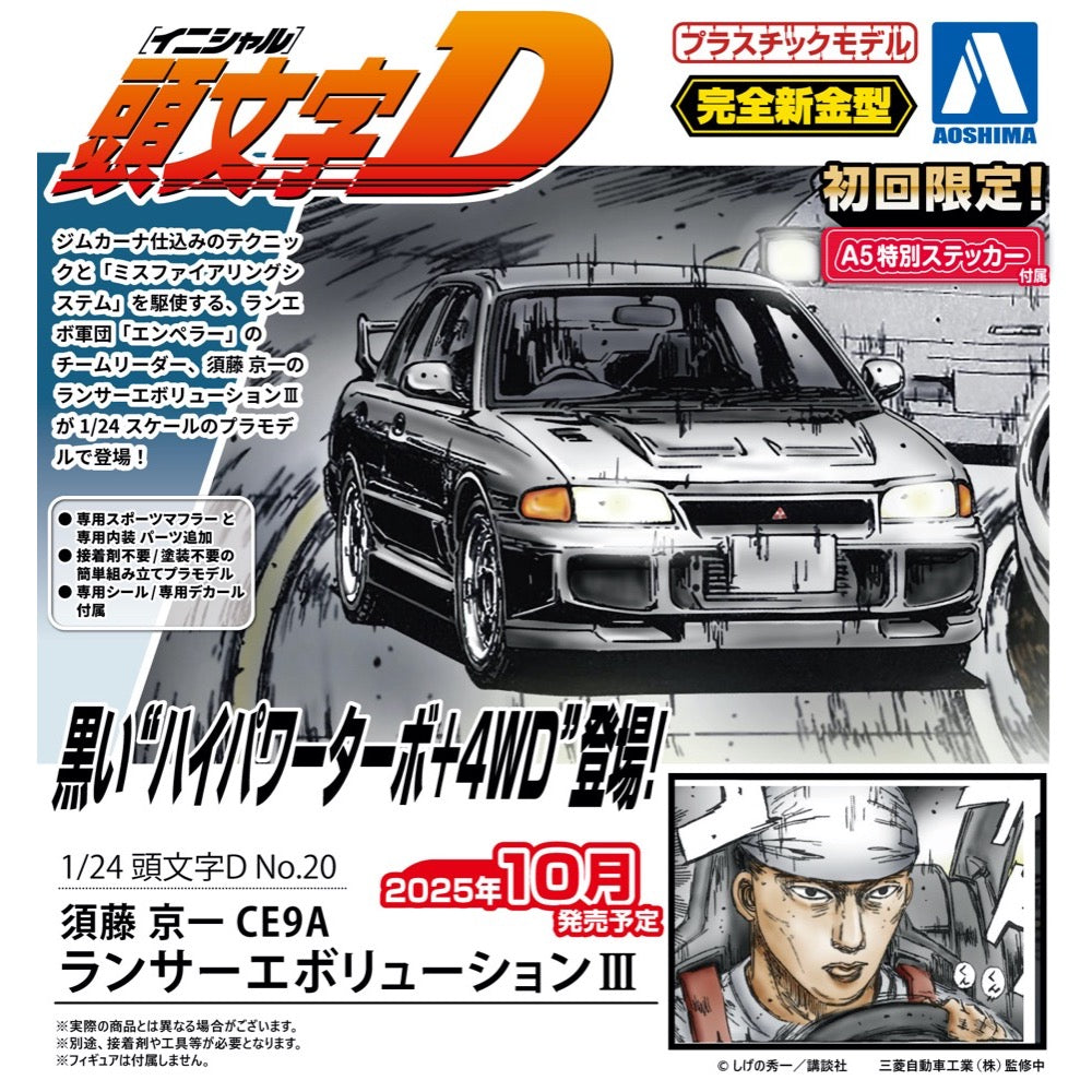 The leader of the “Emperor” team, Kyoichi Sudo, masters gymkhana techniques and utilizes the "Misfiring System" in his Lancer Evolution III. Now, his legendary car is available as a 1/24 scale plastic model kit!
