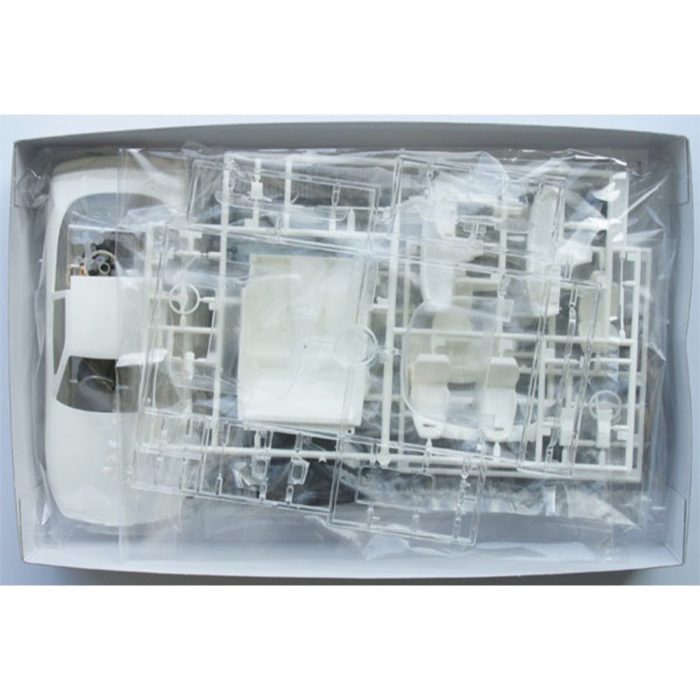 Body, interior and details molded in white. Chassis and details molded in black. Matte chrome rims. Wheels turn and steer after assembly. Can be built as a left-hand or right-hand drive vehicle. Includes exploded-view pictorial-type instructions, with some notes in English and Japanese.