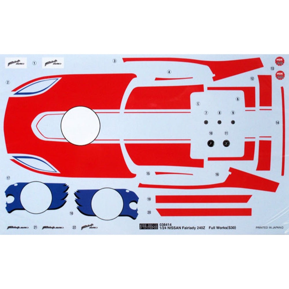 • Fujimi kindly notes that the kit in the box differs slightly from the box art (the kit does not feature a race interior or door mirrors, the over-fender parts have to be attached and some of the sponsorship decals may be missing), since this is essentially their stock Fairlady kit with some racing parts added.