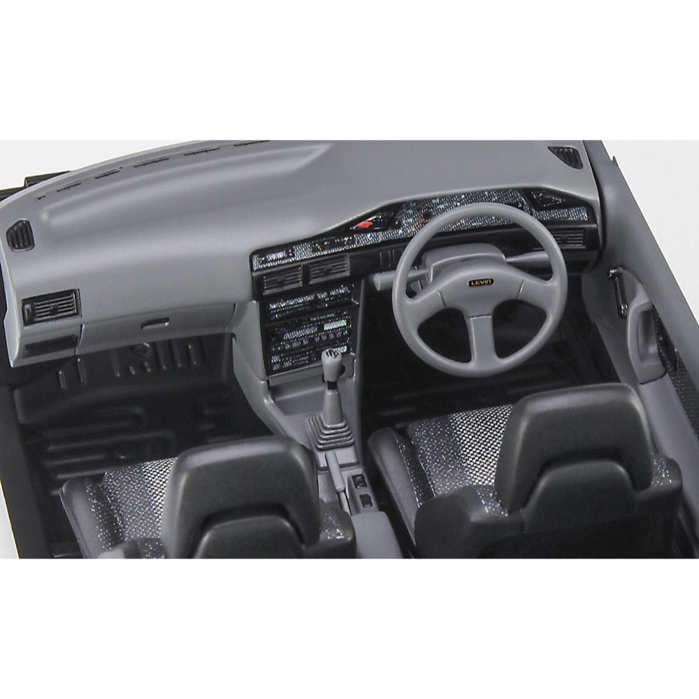 The fifh-generation Toyota Levin was fully remodeled in 1987, and its stylish appearance and affordable price made it a big hit among young people at the time; it was the most popular model of the Levin by sales. This kit reproduces the luxurious GT-APEX model produced in the first half of the year, equipped with electronically controlled suspension TEMS, and with options such as a side spoiler, rear spoiler and aluminum wheels. A masking seal for the windows is included.