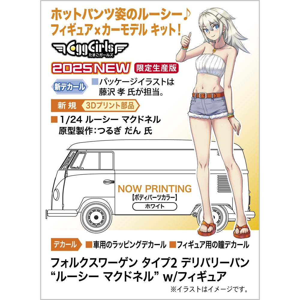 Here comes a 1/24-scale Volkswagen Type 2 delivery van and a same-scale 3D-printed figure of Lucy McDonnell dressed for summer weather in hot pants and a tube top! Wrapping decals for the van and Lucy's eyes are included too.