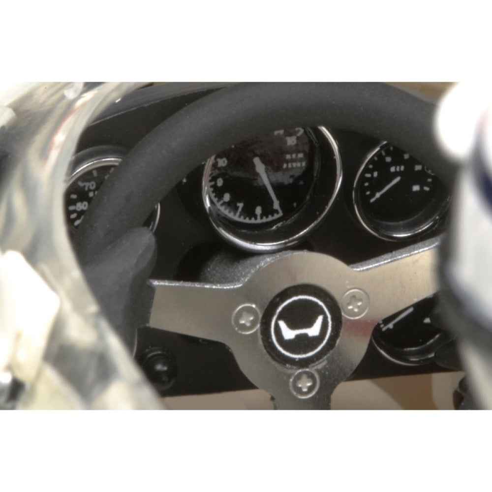 Metal transfer instrumentation rings and photo-etched steering wheel spokes make for a sharp cockpit. The steering wheel moves the front wheels.
