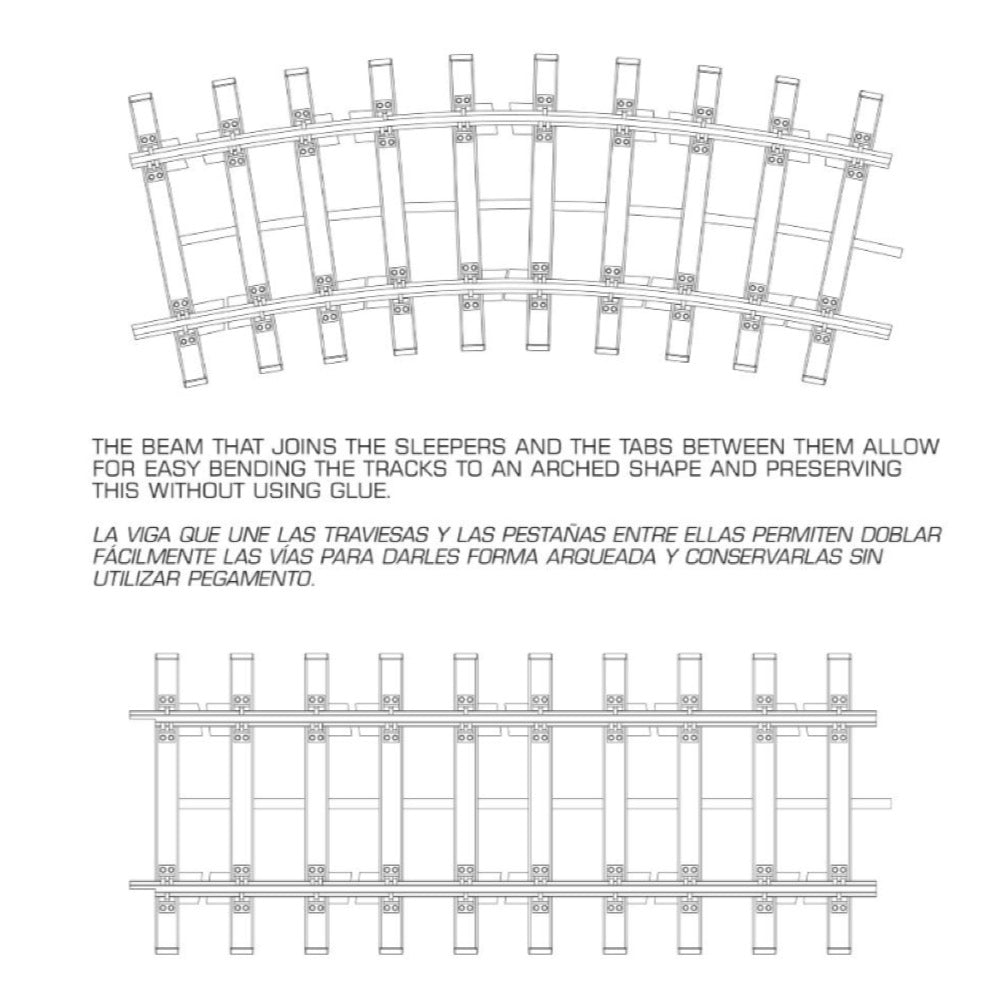 The track section may be given either a straight or arched shape: the beam that joins the sleepers and the tabs between them allow for easy bending the tracks to an arched shape and preserving this without using glue.