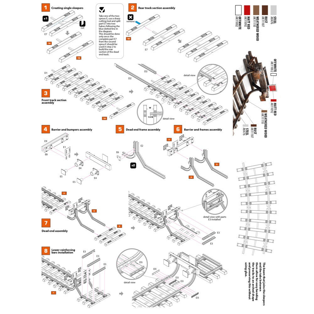 This kit includes 33 high quality injection-moulded plastic parts which can be assembled into a 19 cm-long railway track section with a buffer stop at the end.