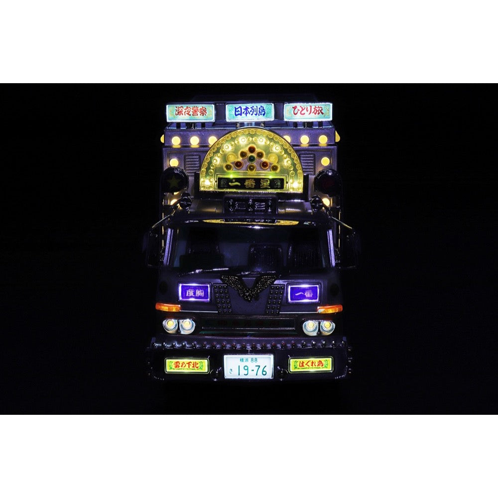 To commemorate the 45th anniversary of the release of the Toei film "Truck Yaro Ichibanboshi," the Boukyo Ichibanboshi is now an RC vehicle from Aoshima! Its lighting, radio control equipment, and electronic circuits have all been renewed and updated to improve quality; various Andon letters and stickers are included too. There are four types of sounds: engine start, V8 running, back buzzer and trumpet. The speed control has also evolved; stable driving has been achieve using radio waves in the 2.4GHz band. Requires ten AA batteries (six for the main vehicle and four for the transmitter).