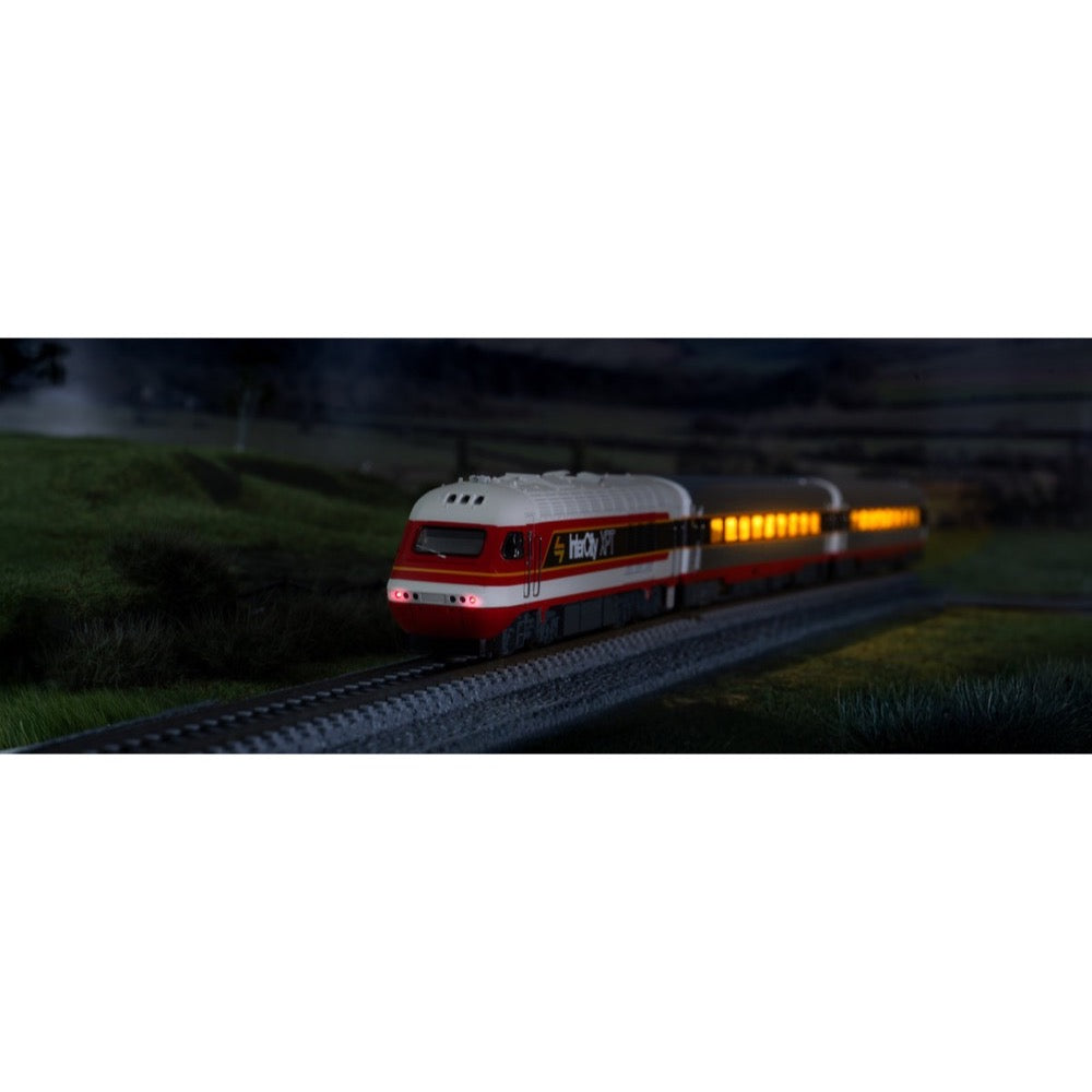 White headlights, red tail lights, and fully illuminated passenger car interiors bring the XPT to life after dark.