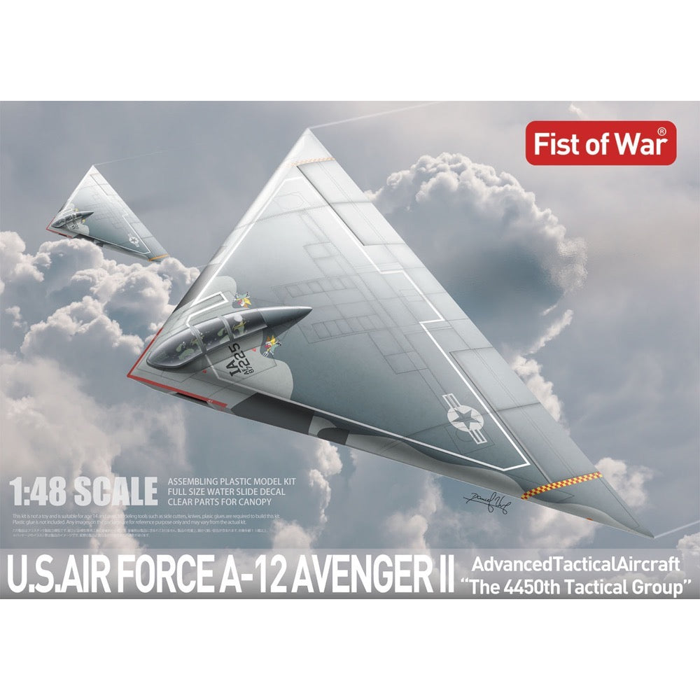 This model kit is a fictional aircraft, the A-12 Avenger II, a stealth attack aircraft born from the ATA (Advanced Tactical Aircraft) plan implemented by the U.S. military in the 1980s.